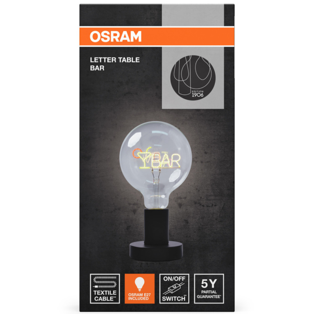 Osram 1906 Letter Table Bar - Vintage asztali lámpa E27 foglalattal, neon színű LED-es "Bar" felitattal, 1,2W, 1200K, fekete fém és üveg