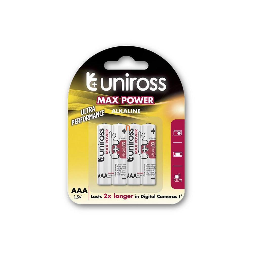 Kíváló kisülési jellemzők -az UNIROSS Power PLus elemeket remek erdményekkel változatos körülmények között tesztelték, szimulálva a valós eszközhasználati környezetet, biztosítva ezeknek az eszközöknek a folyamatos és egyenletes áramellátását.