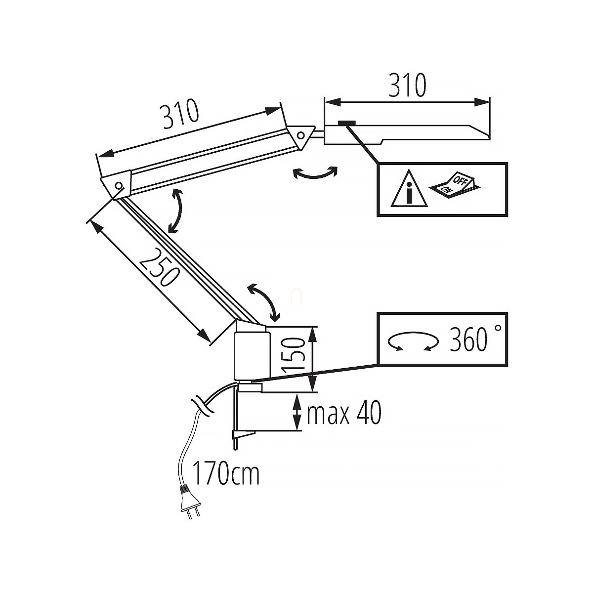 A Heron Kanlux 27603 állítható íróasztali LED lámpa 94 cm hosszúságban, felületre rögzíthető kivitelben készül, fehér színben. A lámpatest 4,8 wattos LED modullal működik, amely 430 lumen fényáramot biztosít 4000 kelvines, hidegfehér színhőmérsékleten. Az alumínium és műanyag anyaghasználat tartósságot és modern megjelenést garantál. A termék IP20 védettséggel rendelkezik, így beltéri használatra alkalmas. Az átlagos élettartam eléri a 20 000 órát. A lámpa funkcionális stílusban készült, egyszerűen rögzíthető az asztalfelületre, és LED fényforrást tartalmaz. A gyártó Kanlux, a logisztikai kód 27603.