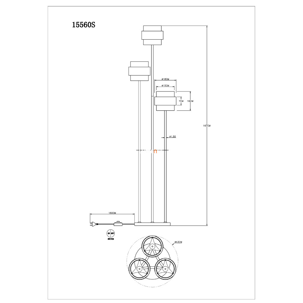 A Milley Globo 15560S állólámpa 167 cm magasságával, modern stílusával és elegáns fekete-sárgaréz színével harmonikusan illeszkedik a lakásvilágítás korszerű megoldásaihoz. A lámpatest három darab E27 foglalattal rendelkezik, amelyek cserélhető fényforrásokat fogadnak. Az üveg és réz anyaghasználat tartósságot, valamint esztétikus megjelenést biztosít. A lámpa IP20 védettséggel rendelkezik, így beltéri használatra alkalmas. A kapcsolóval felszerelt modell nem szabályozható, fényforrást nem tartalmaz. A termék átmérője 430 mm, tömege 12,5 kg, csomagolási méretei 68 cm hosszúság, 39 cm szélesség és 30 cm magasság. A Milley Globo 15560S logisztikai kód alatt érhető el, gyártója a Globo.