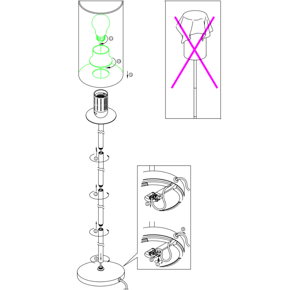 A Troy Eglo 85982 állólámpa modern stílusú, fehér és ezüstszínű kivitelben készül, 153 cm-es magassággal. A lámpatest acélból és üvegből épül fel, 105 mm átmérővel. Egy darab E27 foglalattal rendelkezik, amelybe cserélhető fényforrás helyezhető, a fényforrást a csomag nem tartalmazza. A lámpa talpkapcsolóval vezérelhető, nem szabályozható, IP20 védettségi szinttel rendelkezik, beltéri használatra alkalmas. A termék tömege 3,06 kg, csomagolási méretei 15x22x37 cm.