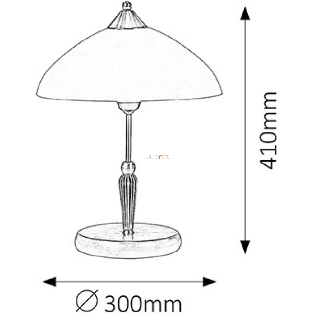 A Regina Rábalux 8172 antik asztali lámpa klasszikus stílusban készült, krémszínű üveg búrával és bronz színű fém vázzal. A lámpa magassága 41 cm, átmérője 30 cm, tömege 2,6 kg. Egy darab E14 foglalattal rendelkezik, amelybe cserélhető fényforrás helyezhető, így a fényáram, a fényszín, a teljesítmény és a színhőmérséklet szabadon választható. A lámpatest IP20 védettséggel rendelkezik, beltéri használatra alkalmas. A bekapcsolást zsinórkapcsoló biztosítja. A termék nem tartalmaz fényforrást. A csomagolás mérete 24x24x34 cm. A lámpát a Rábalux gyártja.