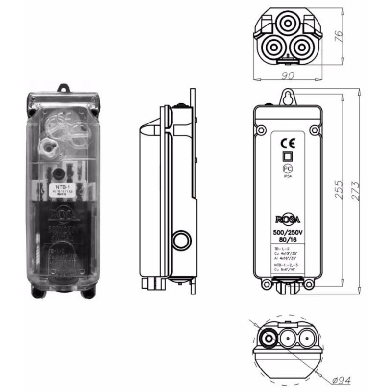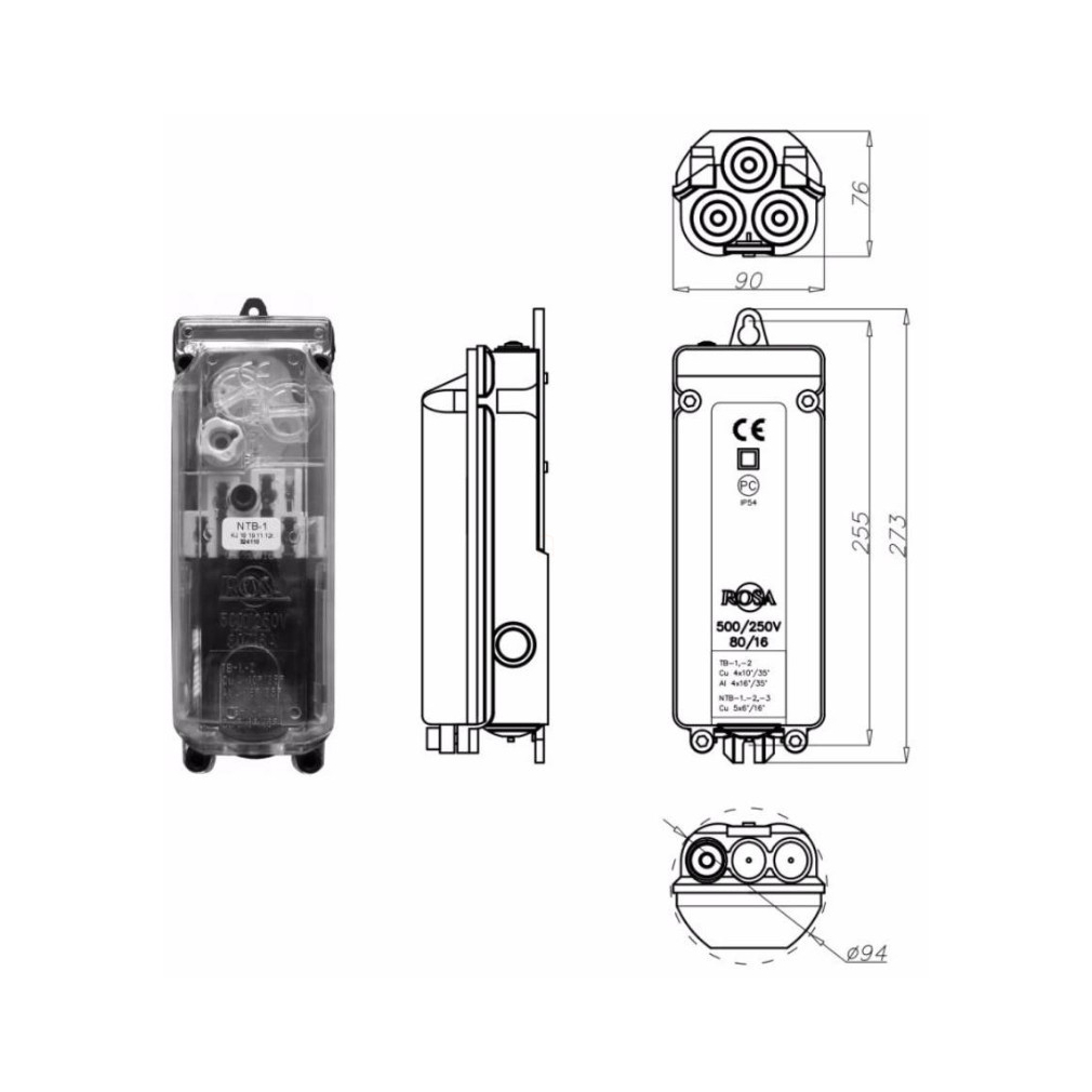 Áramszerlap ROSA NTB-1 egyáramkörös, 5P sorkapoccsal IP54 5x6-16mm2 kábelekhez 324110 1db NEOZED D01 biztosíték kell hozzá
