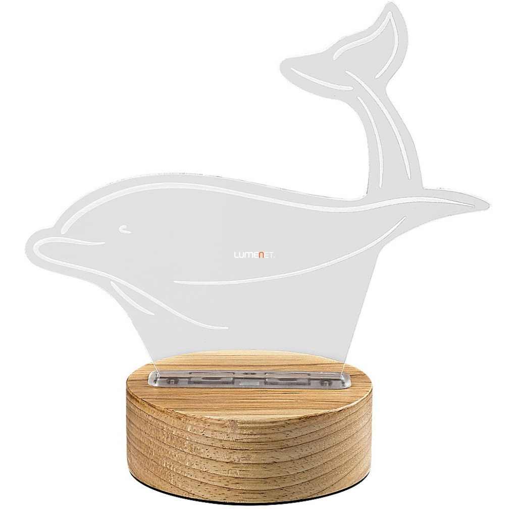 Az Akali Rábalux 76002 asztali gyereklámpa fehér delfin formatervezéssel készül, amely modern megjelenést biztosít bármely gyerekszobában. A lámpatest beépített 2 W teljesítményű LED modullal rendelkezik, amely 50 lumen fényáramot és 3000 K melegfehér színhőmérsékletet nyújt, így kellemes, szemkímélő világítást biztosít. A termék USB csatlakozással működtethető, így egyszerűen csatlakoztatható számítógéphez vagy adapterhez. A lámpa anyaga fa és műanyag, színe fa és áttetsző kombináció. IP20 védettségi szinttel rendelkezik, így beltéri használatra alkalmas. Átlagos élettartama 36 000 óra, méretei 190 mm hosszúság és 205 mm szélesség, tömege 0,26 kg. A termék csomagolási méretei: 14 cm szélesség, 5 cm hosszúság, 18 cm magasság.