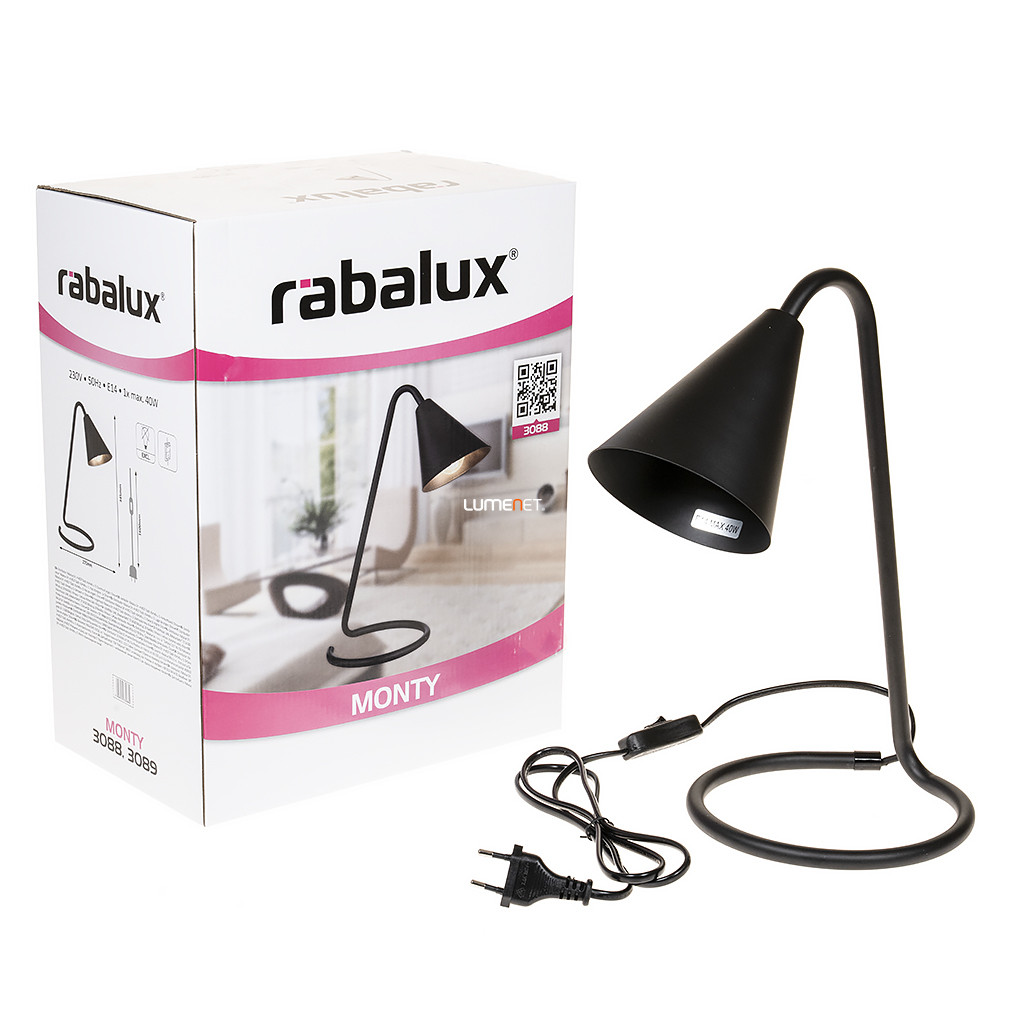A Monty Rábalux 3088 asztali lámpa modern stílusával és kompakt, 34 cm-es magasságával ideális választás íróasztalok vagy éjjeli szekrények megvilágítására. Fekete színű, fém lámpatesttel rendelkezik, amely tartósságot és esztétikus megjelenést biztosít. A lámpa egy darab E14 foglalattal szerelt, amelybe cserélhető fényforrás helyezhető, így a fényáram, fényszín, teljesítmény és színhőmérséklet igény szerint választható. A lámpa nem szabályozható, működtetése zsinórkapcsolóval történik. IP20 védettségi besorolásának köszönhetően beltéri használatra alkalmas. A termék tömege 0,73 kg, csomagolási méretei 28x18x36 cm. A lámpa nem tartalmaz fényforrást, a gyártó a Rábalux.