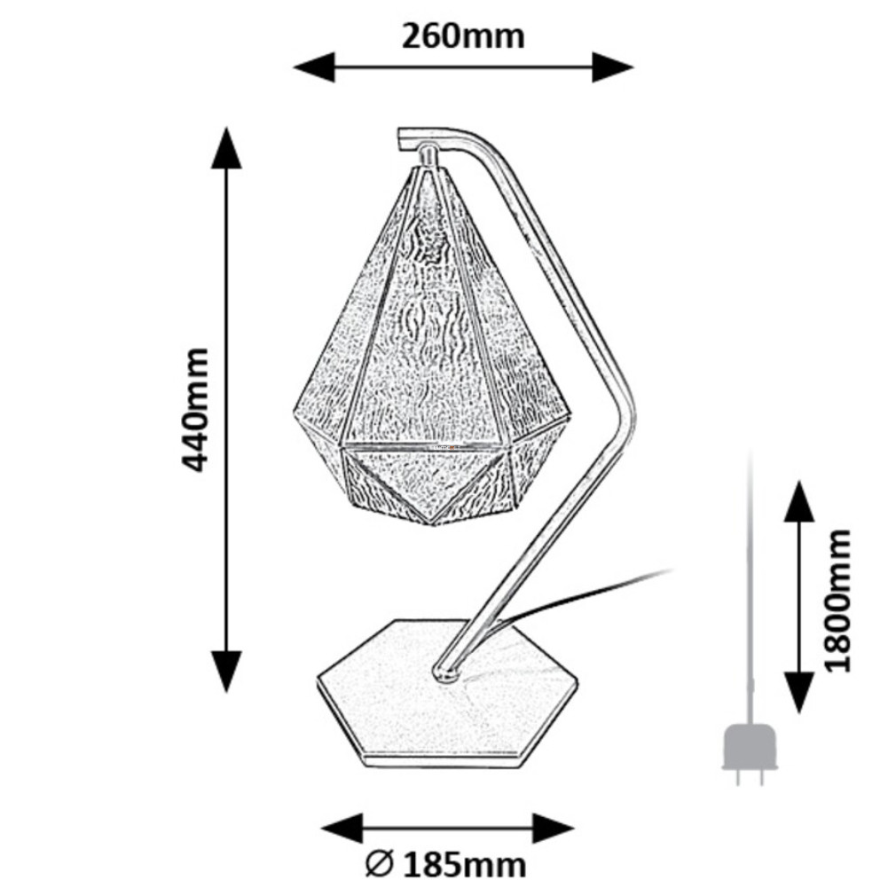 A Norah Rábalux 74201 asztali lámpa arany színű, hatszögletű talppal és áttetsző üveg lámpabúrával rendelkezik. A lámpatest magassága 44 cm, szélessége 18,5 cm, hossza 26 cm, tömege 1,65 kg. A termék 1 darab E14 foglalattal szerelt, amelybe cserélhető fényforrás helyezhető, a maximális teljesítmény, fényáram és színhőmérséklet a behelyezett izzótól függően változik. A lámpa 230 V névleges feszültséggel működik, védettsége IP20. A vezetéke 1,8 méter hosszú, textil borítású, ami elegáns megjelenést biztosít. A lámpatest fő anyaga fém, míg a búra üvegből készült. A termék nem tartalmaz fényforrást. A csomagolás mérete 49x32x27 cm.