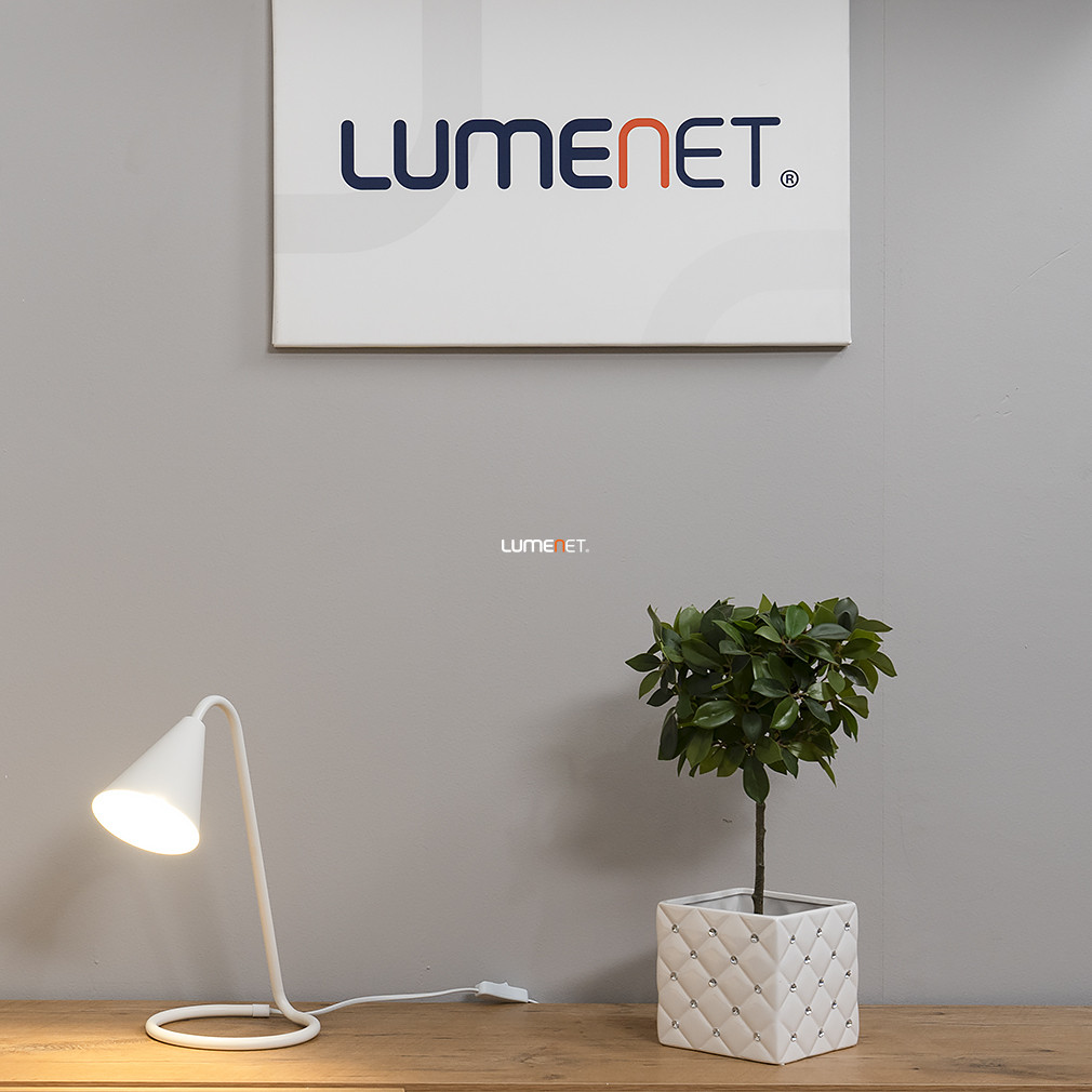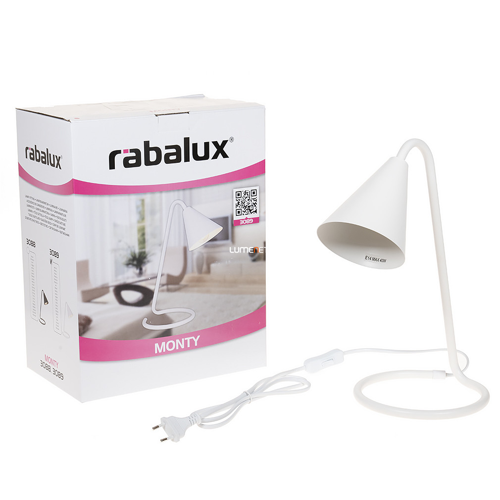 A Monty Rábalux 3089 asztali lámpa modern stílusban, fehér színben készült, masszív fémszerkezetének köszönhetően tartós és stabil. A lámpa 34,5 cm magasságú, hossza 27 cm, egy darab E14 foglalattal rendelkezik, amelybe tetszőleges, cserélhető fényforrás helyezhető. A lámpatest nem tartalmaz fényforrást, így a világítás teljesítménye, színhőmérséklete és fényszíne szabadon választható, a felhasználó igényei szerint. A lámpa IP20-as védettséggel rendelkezik, beltéri használatra alkalmas. A zsinórkapcsolóval ellátott kivitel egyszerű és kényelmes működtetést biztosít. A termék tömege 0,73 kg, csomagolási méretei 28 cm szélesség, 18 cm hosszúság és 36 cm magasság. A gyártó a Rábalux.