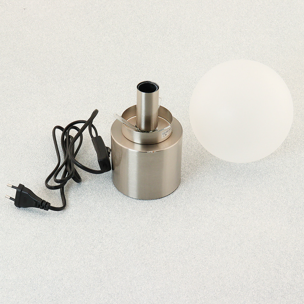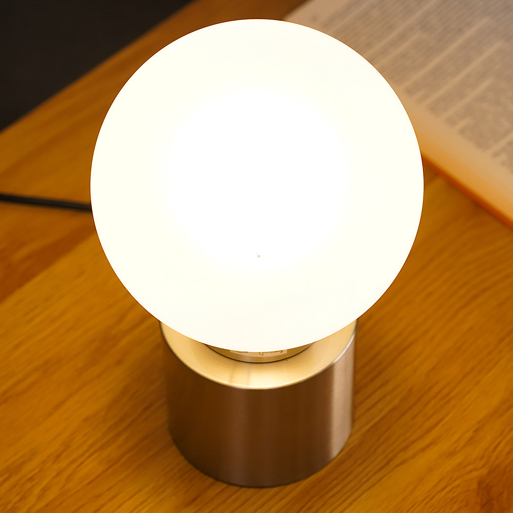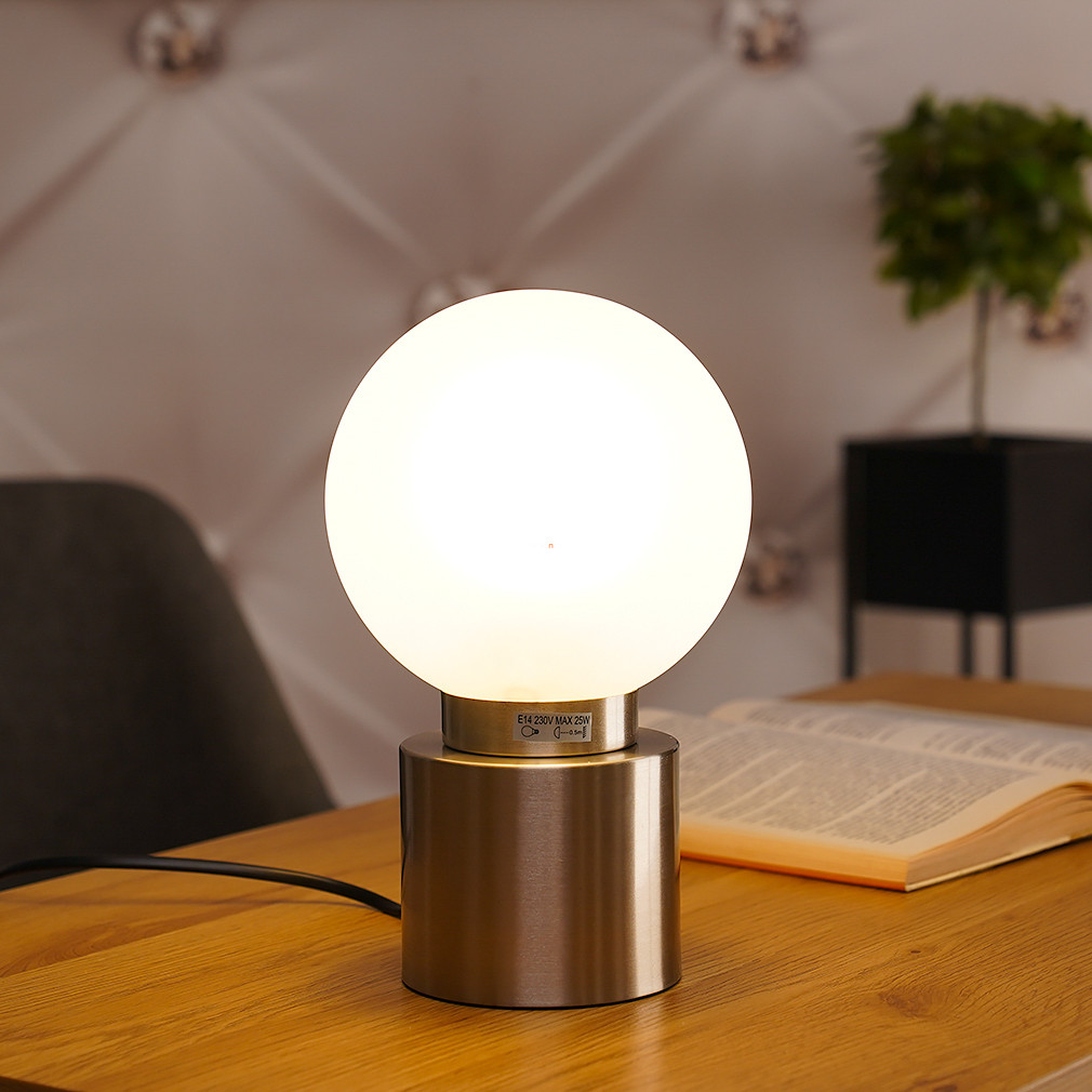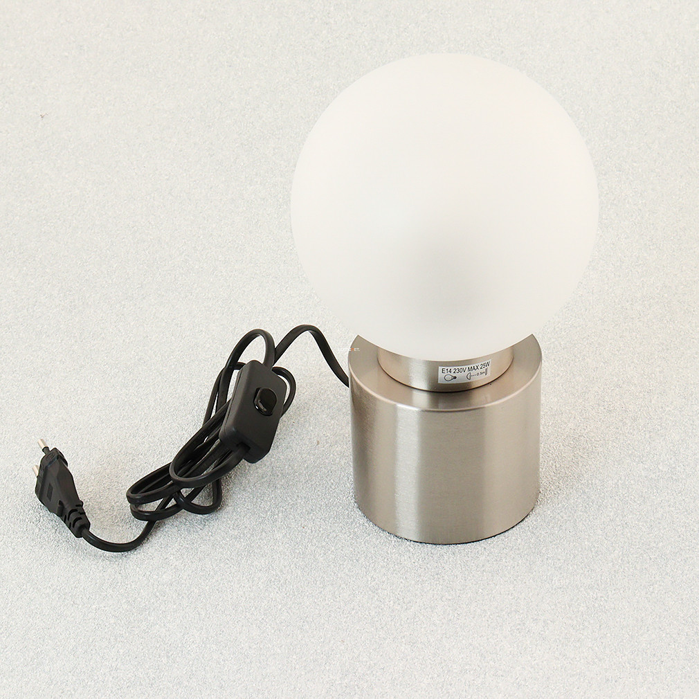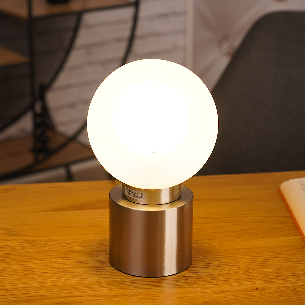 Az Asztali lámpa gömb, 15 cm átmérővel rendelkező modell a Globo 21003N sorozatból származik, amely egyetlen E14 foglalattal szerelt. A lámpatest üveg és fém anyaghasználattal készült, nikkel és opál színkombinációban. A termék magassága 24,5 cm, tömege 0,63 kg. A lámpatest IP20 védettségi besorolással rendelkezik, így beltéri használatra alkalmas. A fényforrás nem tartozék, a fényáram, fényszín, teljesítmény és színhőmérséklet a behelyezett izzótól függően változik. A csomagolás méretei: 17x17x29 cm. A terméket a Globo. gyártja.