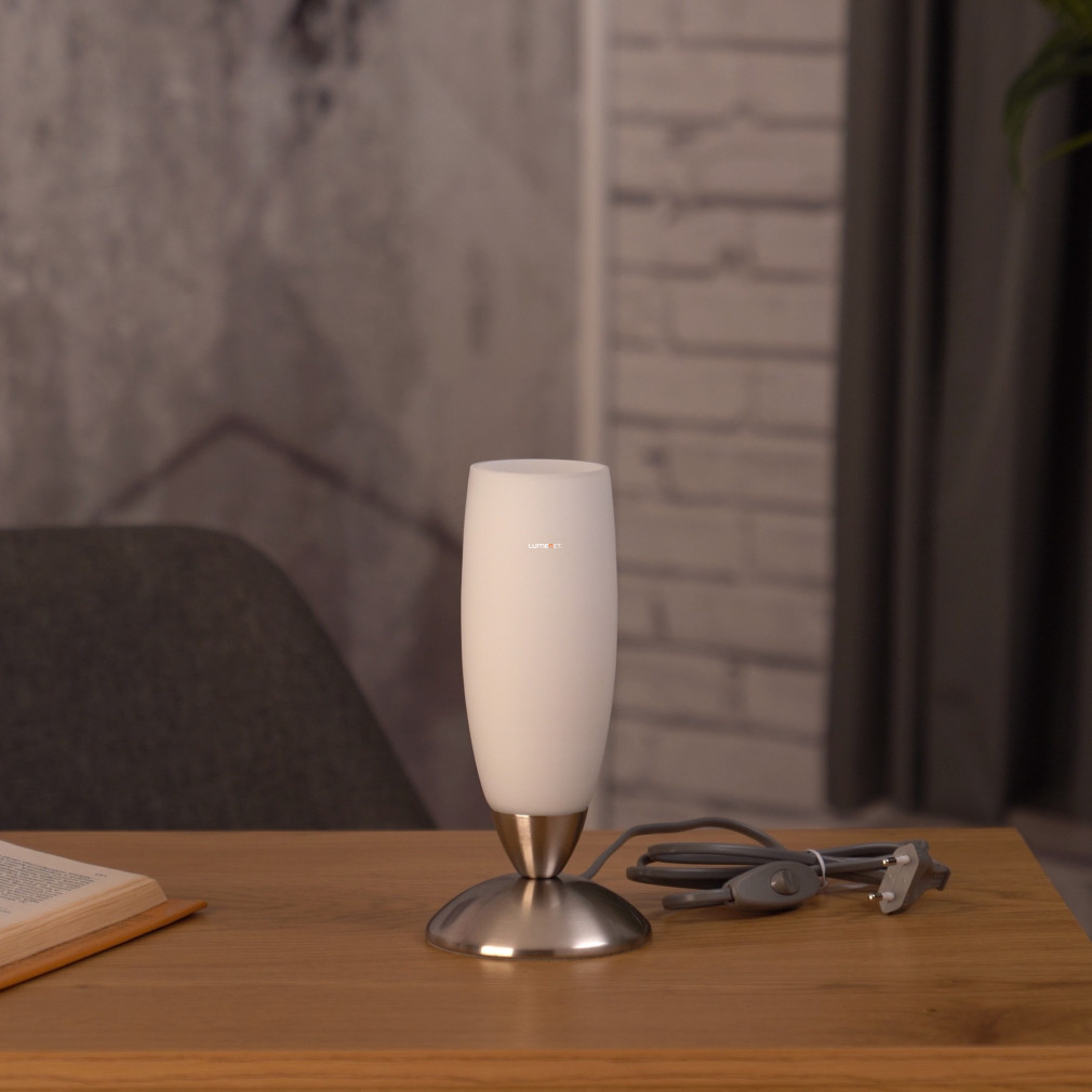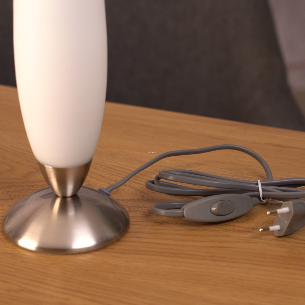 Az Eglo Slim 82305 kehely alakú asztali lámpa modern stílusával és letisztult formavilágával illeszkedik a korszerű otthoni vagy irodai környezetekhez. A lámpatest 22 cm magasságú, átmérője 7 cm, anyaga acél és üveg, színe fehér és ezüst. Egy darab E14 foglalattal rendelkezik, amely cserélhető fényforrással működik, a fényforrás nem tartozék. A kapcsolás zsinórkapcsolóval történik, a lámpa nem szabályozható. A termék IP20-as védettségi besorolással rendelkezik, így beltéri használatra ajánlott. A csomagolás méretei: 11 cm szélesség, 10 cm hosszúság, 20 cm magasság, a lámpa tömege 0,5 kg. A logisztikai kód 82305, a gyártó az EGLO.