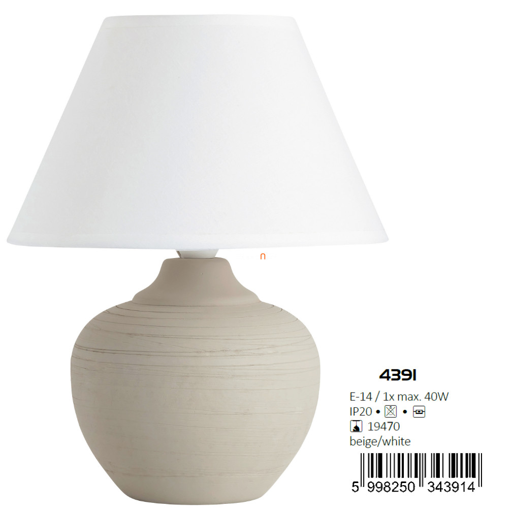 A Molly Rábalux 4391 asztali lámpa modern stílusú, bézs színű kerámia talppal és fehér textil lámpaernyővel rendelkezik. A lámpa magassága 25 cm, átmérője 20,5 cm, tömege 0,5 kg. Egy darab E14 foglalattal szerelt, amelybe cserélhető fényforrás helyezhető, a fényforrást a termék nem tartalmazza. A lámpa zsinórkapcsolóval kapcsolható, és nem szabályozható. IP20 védettségi besorolással ellátott, így beltéri használatra alkalmas. A csomagolás méretei 19x19x19 cm. A terméket a Rábalux gyártja, logisztikai kódja 4391.