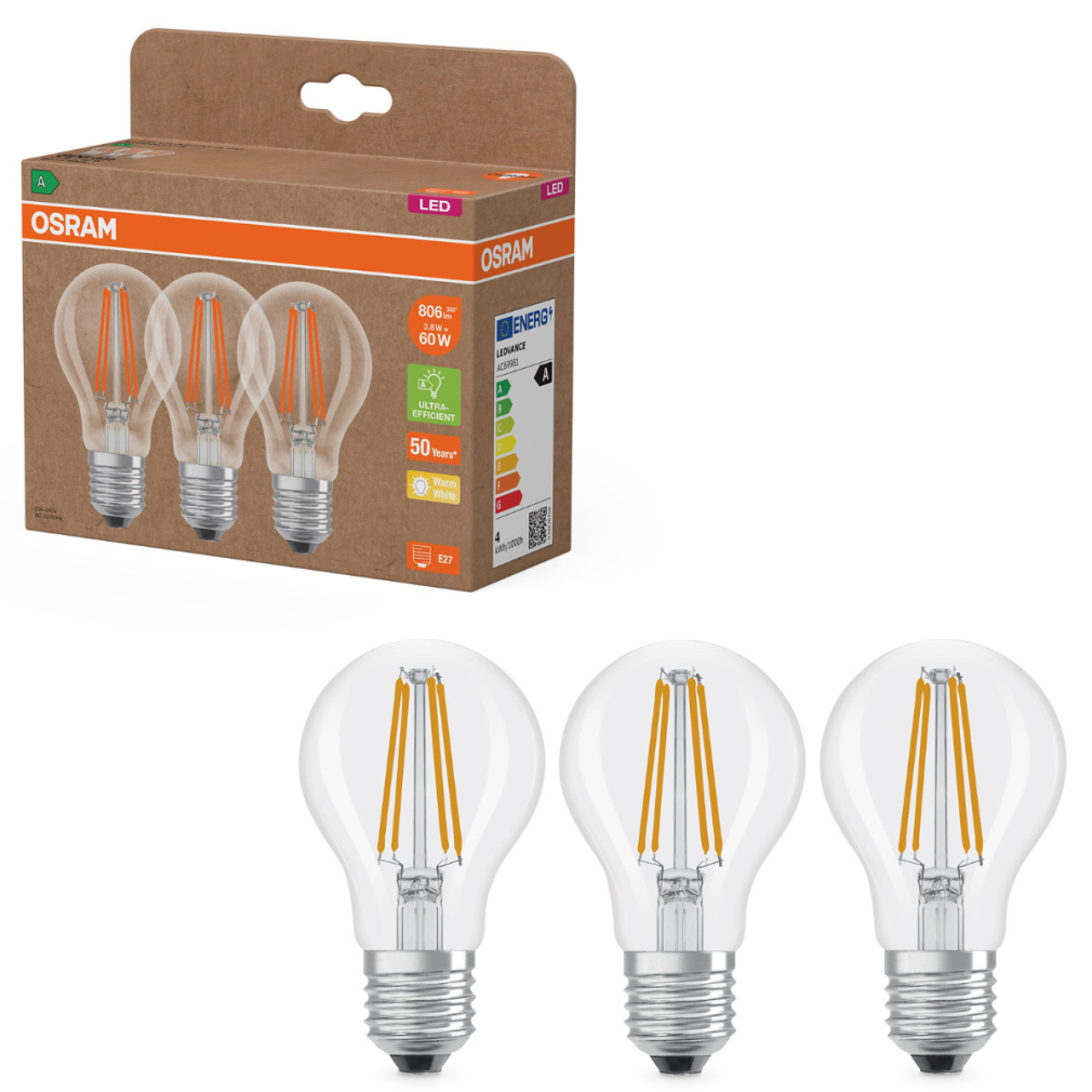 Bontott csomagolású Osram E27 LED 3,8W, 806 lm, 2700 K, melegfehér, áttetsző üveg-60 W normál izzó helyett, 3 darabos - Superstar+ Classic A filament