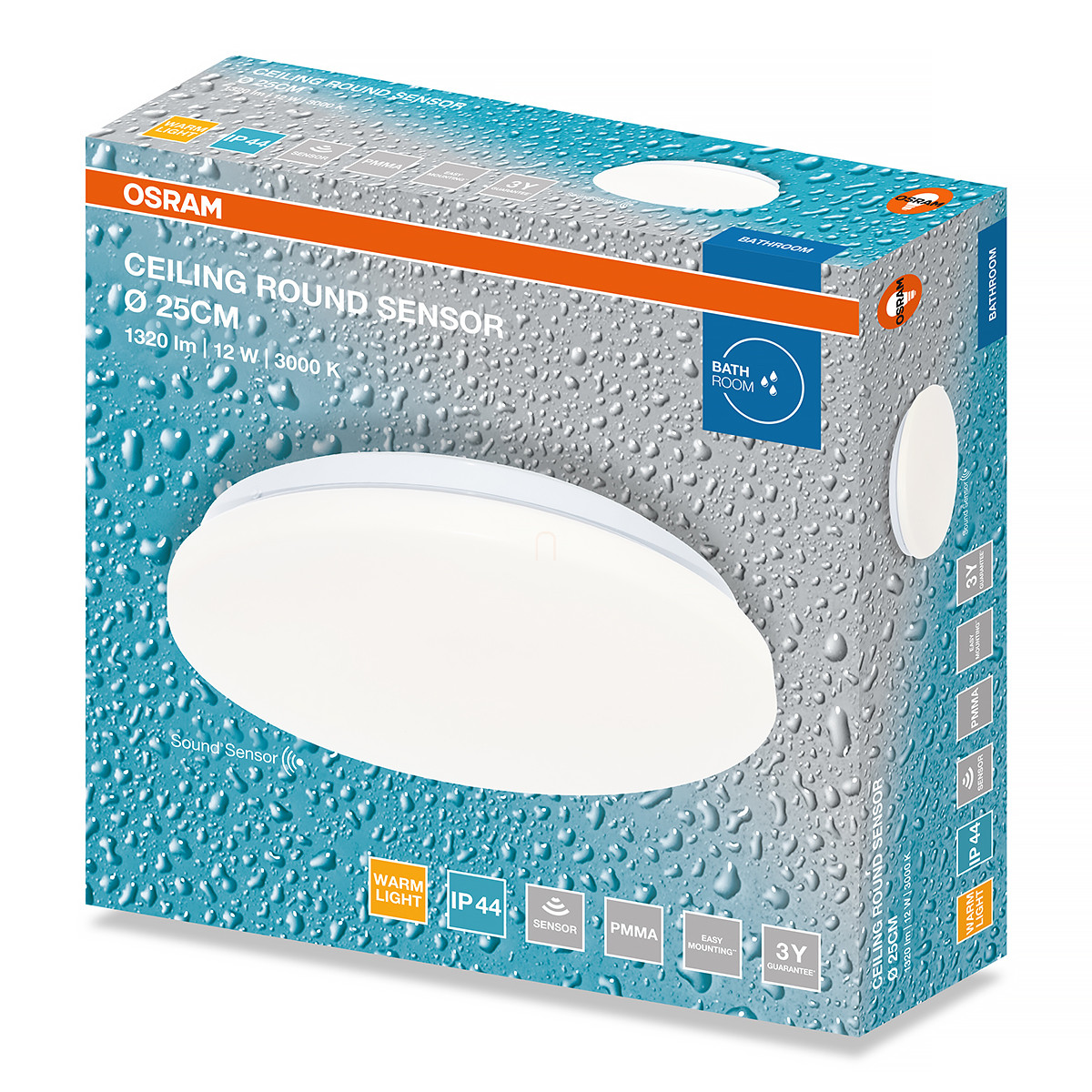 Osram Ceiling Round Sensor fürdőszobai mennyezeti LED lámpa hang és fényérzékelővel, 26 cm, 12 W, 3000 K, 960 lm, matt fehér színben
