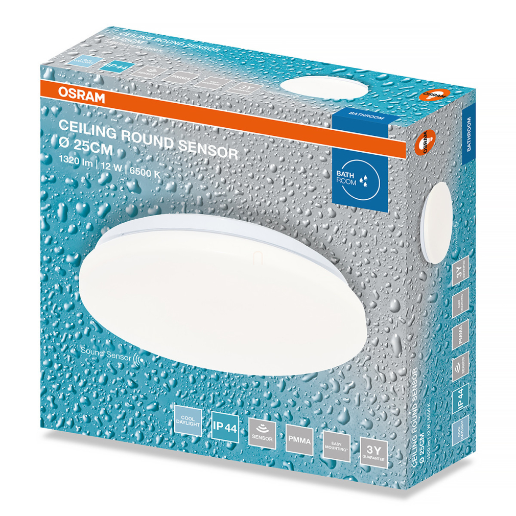 Osram Ceiling Round Sensor fürdőszobai mennyezeti LED lámpa hang és fényérzékelővel, 26 cm, 12 W, 6500 K, 960 lm, matt fehér színben