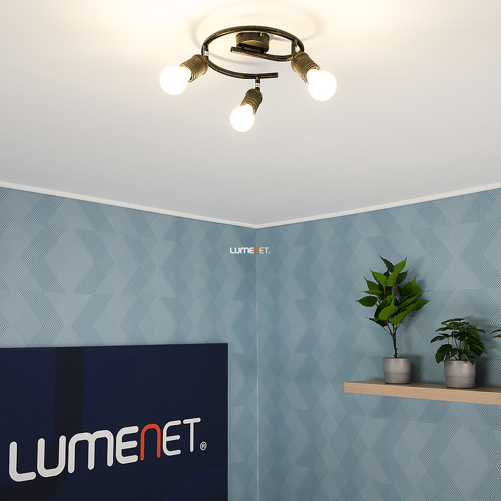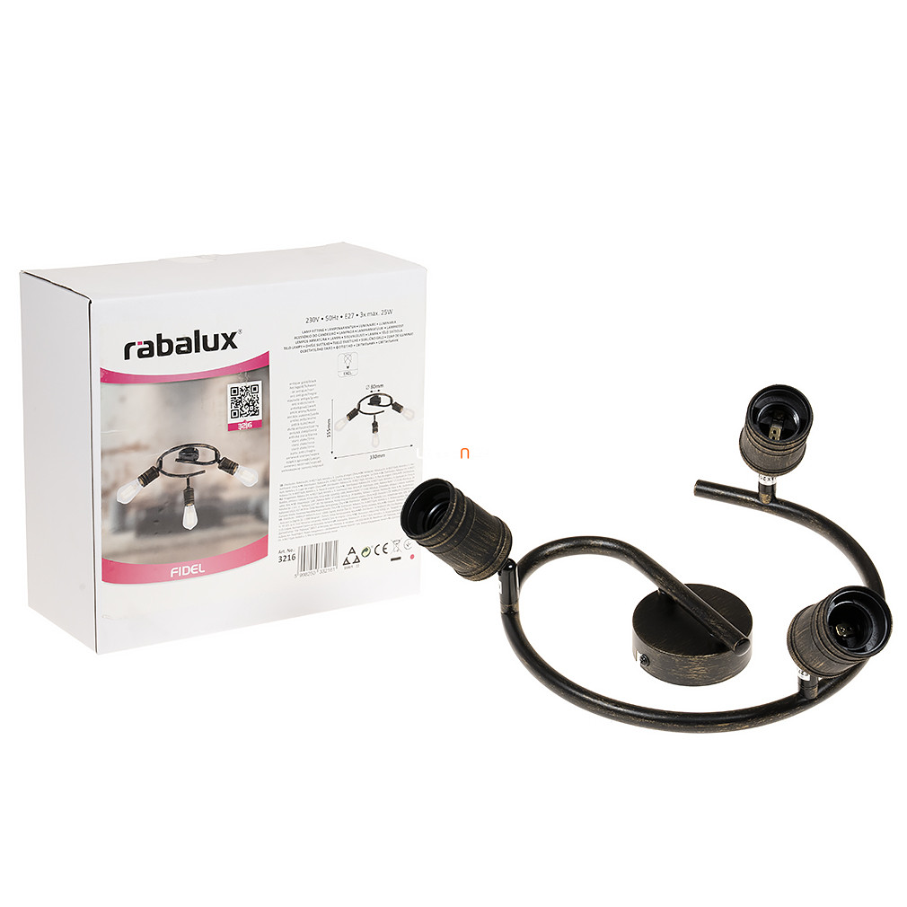 A Fidel Rábalux 3216 csigavonalas spot lámpa három E27-es foglalattal rendelkezik, amelyek lehetővé teszik a cserélhető fényforrások alkalmazását a kívánt fényáram, színhőmérséklet és teljesítmény kiválasztásához. A lámpatest vintage stílusú, arany és antikolt fém kivitelben készül, amely időtálló megjelenést biztosít. Átmérője 330 mm, magassága 155 mm, tömege 0,71 kg. IP20 védettséggel rendelkezik, így beltéri használatra alkalmas. A lámpa nem tartalmaz fényforrást, így a felhasználó szabadon választhatja meg a megfelelő izzókat. A termék nem szabályozható, minden foglalat 3xE27 típusú. A csomagolás méretei: 25 cm szélesség, 11 cm hosszúság, 24 cm magasság. A gyártó a Rábalux, a logisztikai kód 3216.