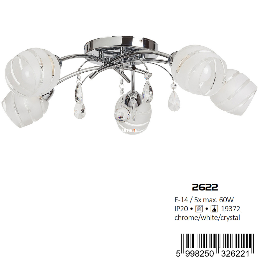 A Melissa Rábalux 2622 csíkos csillár kristály díszekkel klasszikus stílusú mennyezeti lámpatest, amely öt darab E14 foglalattal rendelkezik. A lámpatest fő anyaga fém, amelyet üveg kristály díszítések egészítenek ki, ezüst és opál színkombinációban. A csillár átmérője 600 mm, magassága 185 mm, tömege 2,25 kg. A termék IP20 védettségi besorolással rendelkezik, így beltéri használatra alkalmas. A fényforrás cserélhető, nem tartozék, a lámpatest nem szabályozható. A csomagolás méretei: 37 cm szélesség, 26 cm hosszúság és 20 cm magasság. A terméket a Rábalux gyártja, logisztikai kódja 2622.