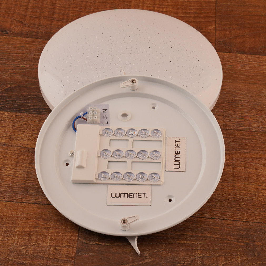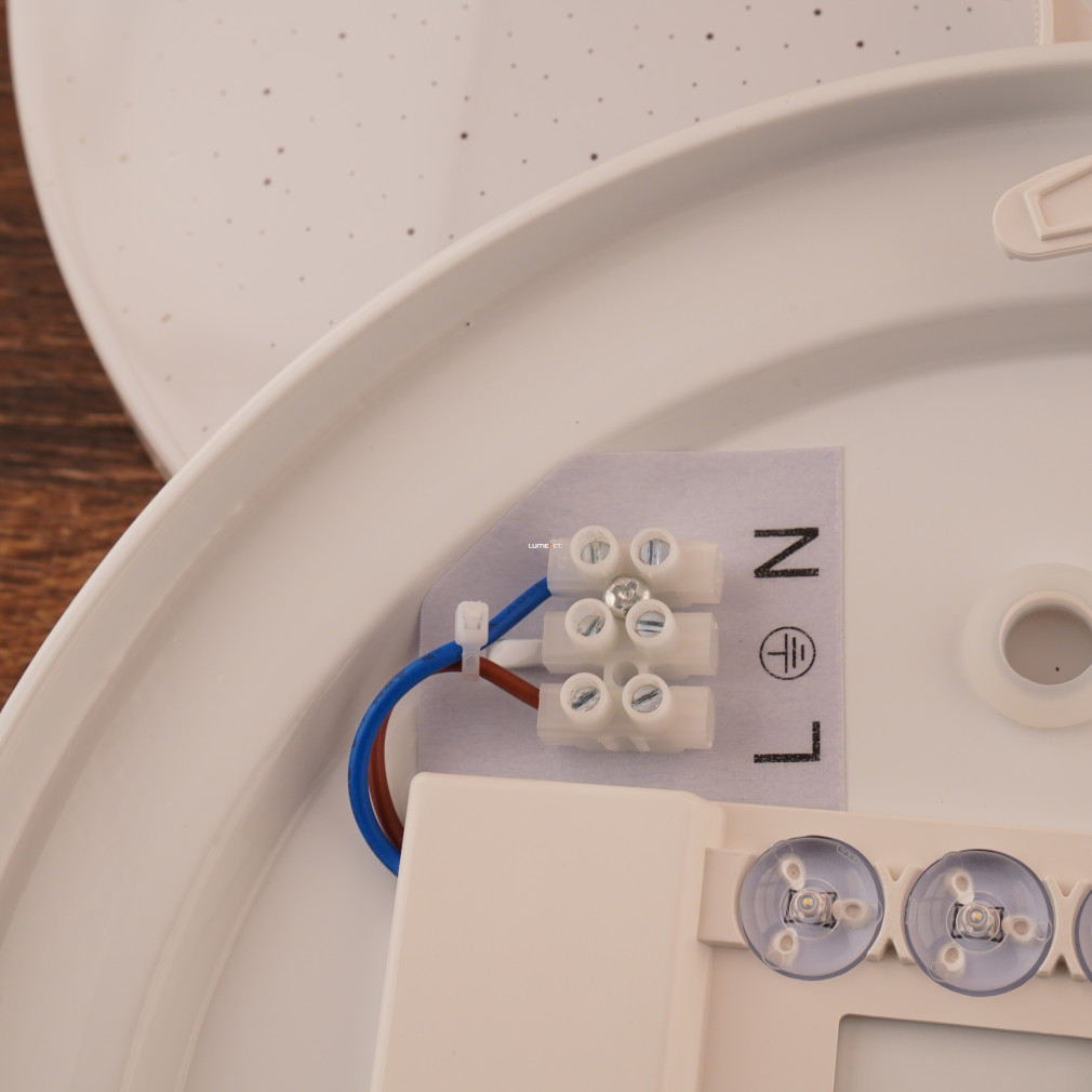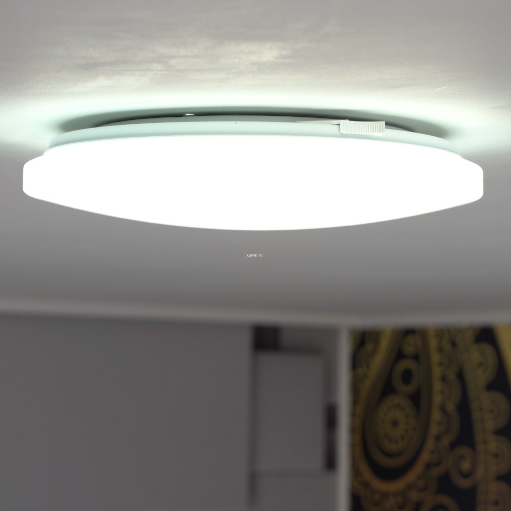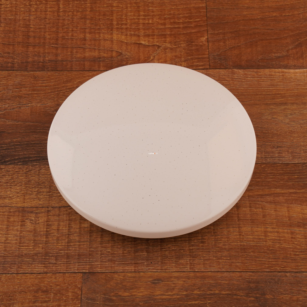 A Frania Eglo 33604 csillám hatású mennyezeti LED lámpa modern kialakítású, kerek formával és fehér színnel rendelkezik. A lámpatest 11,5 watt teljesítményű, beépített LED modullal működik, amely 1100 lumen fényáramot biztosít hidegfehér, 4000 kelvines színhőmérsékleten. Az IP20 védettségi szintű lámpatest műanyag és acél alapanyagokból készült, átmérője 280 mm, magassága 70 mm. A termék nem szabályozható, fényforrást tartalmaz, és kizárólag beltéri használatra alkalmas. A csillám hatású felület különleges vizuális élményt nyújt a helyiség megvilágításához, a modern stílusú kivitel pedig harmonikusan illeszkedik a lakásvilágítási megoldásokhoz.