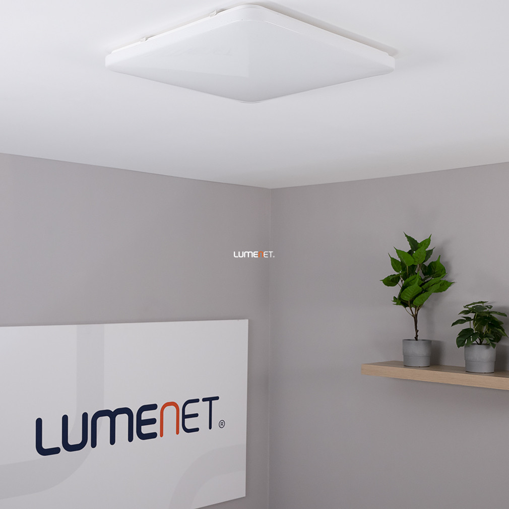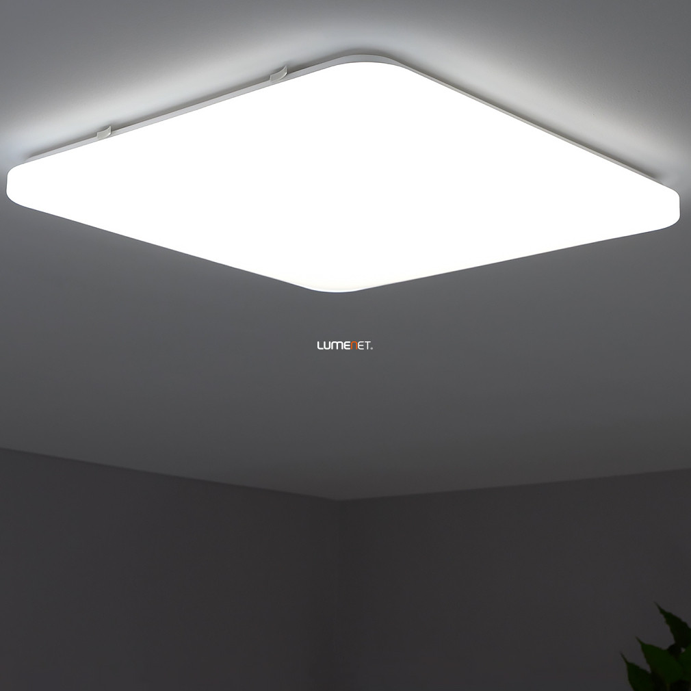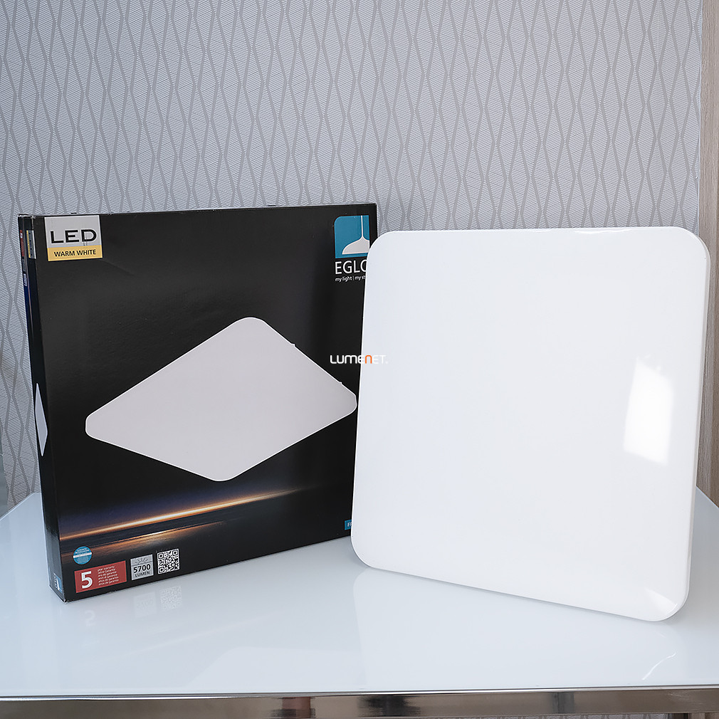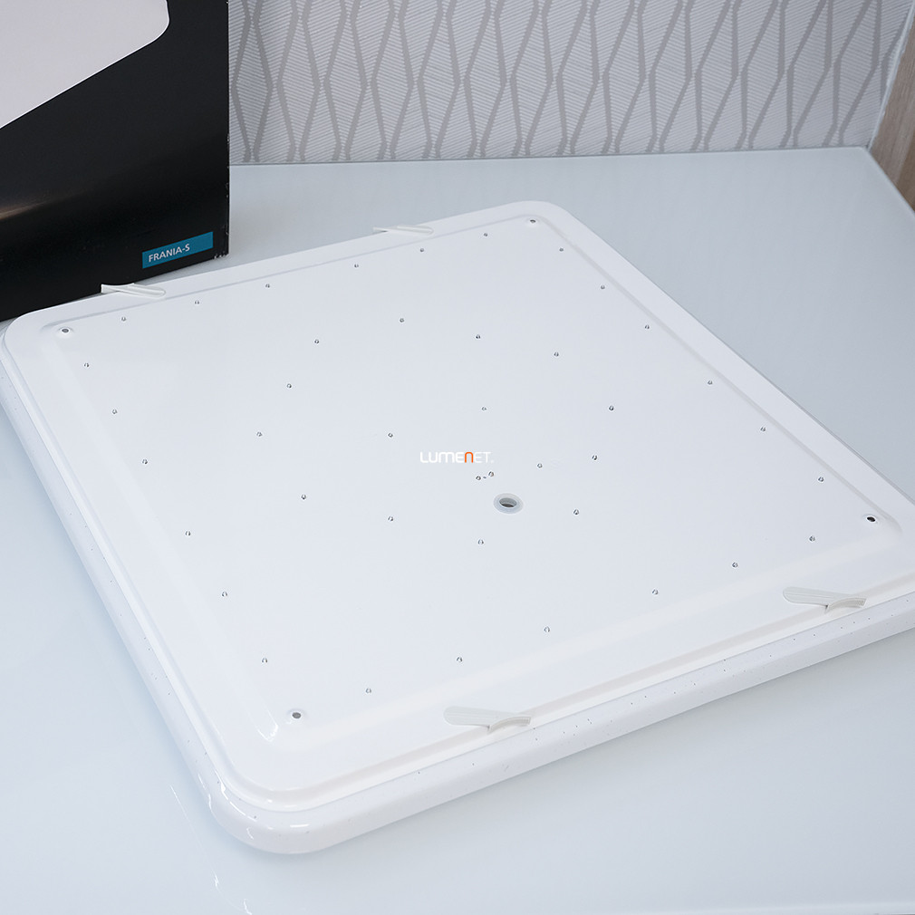 A Frania-S Eglo 98449 csillám hatású mennyezeti LED lámpa modern kialakítású, szögletes formában, 53x53 cm-es méretben készült. A lámpatest fehér színű, acél és műanyag anyaghasználattal rendelkezik, amely biztosítja a tartósságot és a letisztult megjelenést. A beépített LED modul 49,5 W teljesítményt nyújt, a fényáram eléri az 5900 lument, így kiváló fényerőt biztosít. A fény színhőmérséklete 3000 Kelvin, melegfehér fénnyel világítja meg a helyiséget. A lámpa IP20 védettségi besorolással rendelkezik, beltéri használatra alkalmas. A termék tömege 2,5 kg, magassága 65 mm, csomagolási méretei 57x57x8 cm. A LED fényforrás tartozék, külön izzó beszerzése nem szükséges. A Frania-S Eglo 98449 mennyezeti lámpa logisztikai kódja 98449, gyártója az EGLO.