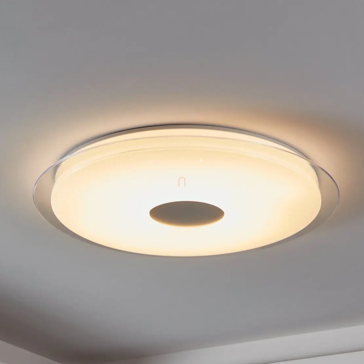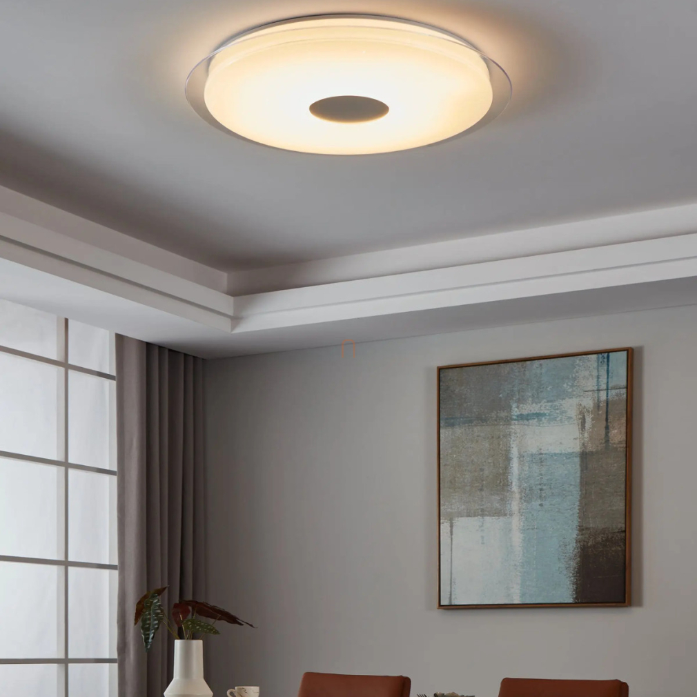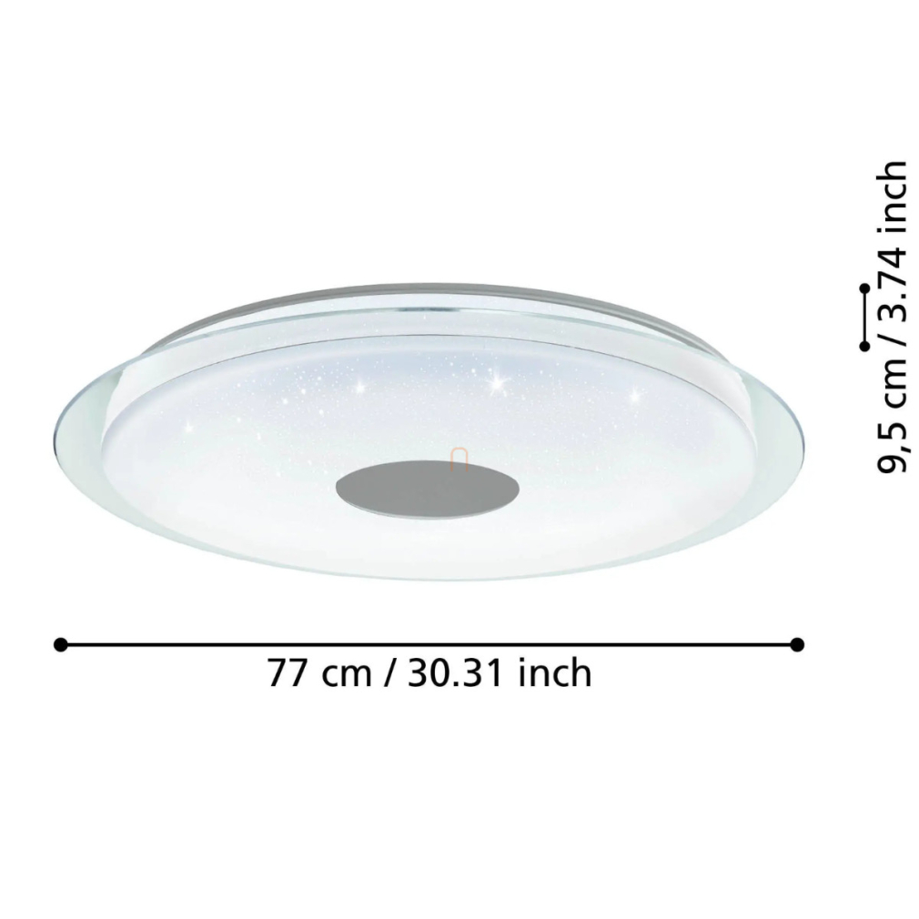 A Lanciano Eglo 900006 csillám hatású, szabályozható mennyezeti LED lámpa modern technológiával készült, amely 38,1 W teljesítményű LED modult tartalmaz, 5350 lumen fényárammal. A lámpatest átmérője 770 mm, magassága 95 mm, így nagyobb helyiségek megvilágítására is alkalmas. A fény színhőmérséklete 2700 és 6500 Kelvin között változtatható, így hideg és melegfehér fény között lehet választani, alkalmazkodva a különböző igényekhez. A fényerősség applikációval vagy külön megvásárolható távirányítóval szabályozható. A lámpa kivitele csillám hatású, anyaga acél és műanyag, színe fehér-króm. A LED modul beépített, nem cserélhető, IP20 védettséggel rendelkezik, így beltéri használatra alkalmas. A termék tömege 6,05 kg, csomagolási méretei 81x81x15 cm. A Lanciano Eglo 900006 mennyezeti lámpa a modern lakásvilágítás igényeire lett fejlesztve, és a gyártója az EGLO.