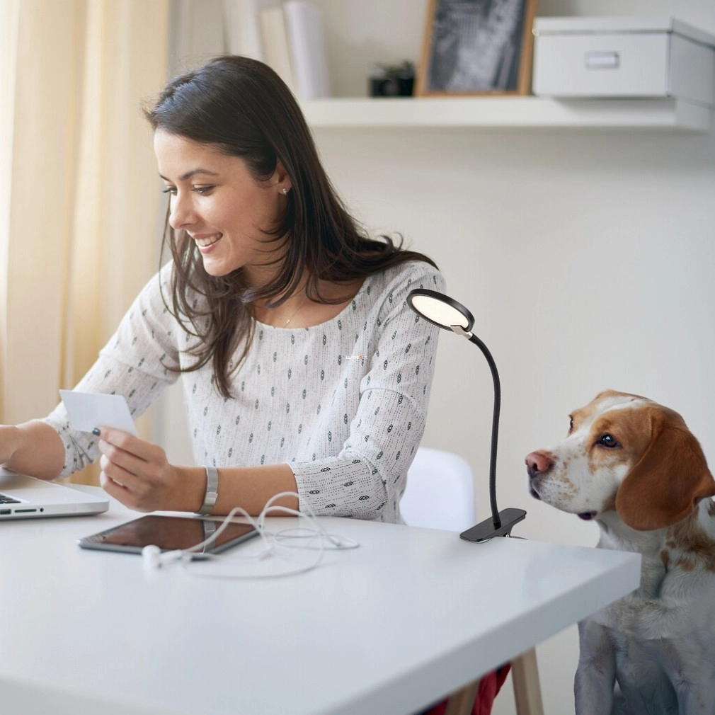 A Marcin Rábalux 74199 csíptethető LED lámpa 36 cm hosszúságú, modern asztali világítási megoldás, amely 7 W teljesítményű, integrált LED modullal működik. A lámpatest fényárama 350 lumen, melegfehér (3000 K) fénnyel, amely kellemes hangulatot teremt. A szabályozható fényerősség érintőkapcsolós technológiával vezérelhető, így a megvilágítás könnyedén az igényekhez igazítható. A lámpa névleges feszültsége 12 V, energiaosztálya G, átlagos élettartama pedig 25 000 óra. A műanyagból készült, fekete és fehér színben elérhető lámpatest IP20 védettséggel rendelkezik, így beltéri használatra alkalmas. Kompakt kialakításának és csíptethető rögzítésének köszönhetően könnyen elhelyezhető különböző felületeken, legyen szó íróasztalról vagy polcról.