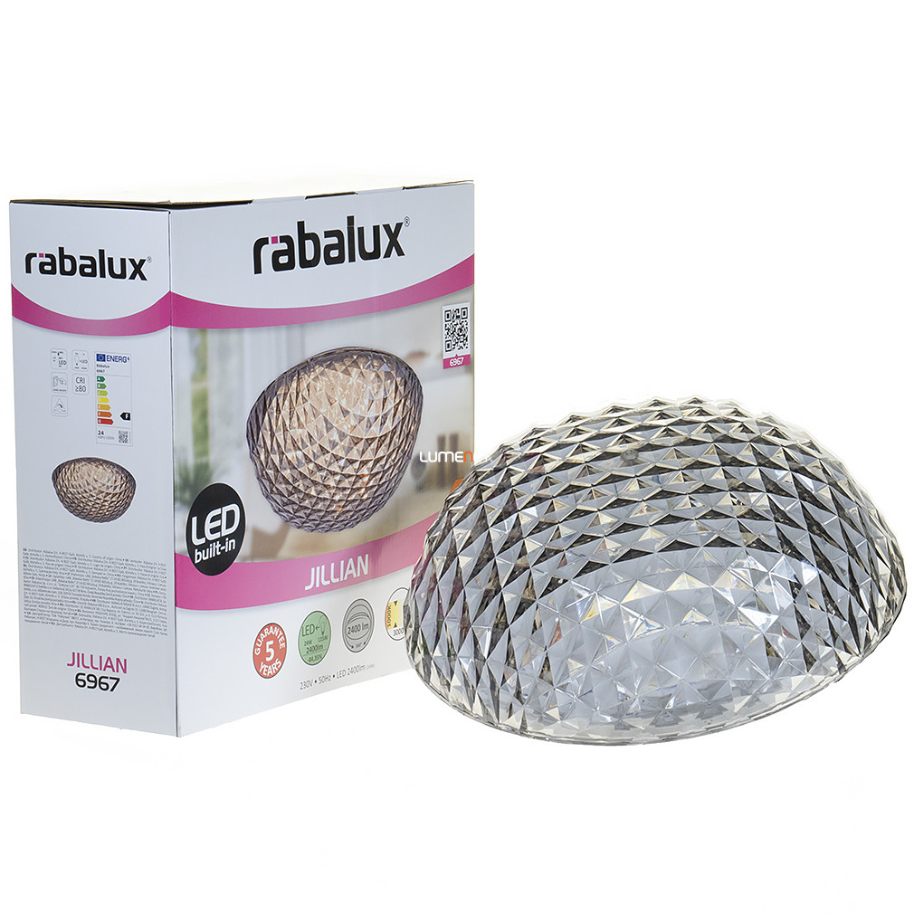 A Jillian Rábalux 6967 mennyezeti LED lámpa csiszolt üveg hatású burkolattal rendelkezik, amely modern megjelenést biztosít bármely lakótérben. A lámpatest 24 W teljesítményű, integrált LED modullal van felszerelve, amely 2400 lumen fényáramot nyújt melegfehér, 3000 K színhőmérsékletű fénnyel. A termék átmérője 410 mm, magassága 170 mm, anyaga fém és műanyag, színe áttetsző és szürke. Az IP20 védettségi besorolás beltéri használatra teszi alkalmassá. A lámpa nem szabályozható, fényforrást tartalmaz, foglalata LED modul. A csomagolás méretei: 41 cm hosszú, 41 cm magas és 16 cm széles, tömege 1,58 kg. Gyártója a Rábalux.