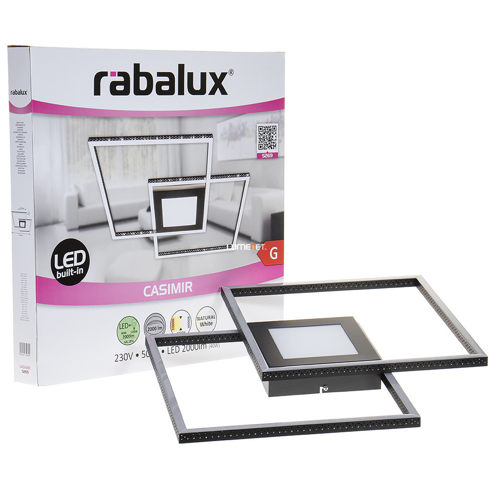 A Casimir Rábalux 5269 csúsztatott modern mennyezeti LED lámpa 40 W teljesítményű, integrált LED modullal rendelkezik, amely 2000 lumen fényáramot biztosít. A lámpatest hidegfehér, 4000 K színhőmérsékletű fényt bocsát ki, amely ideális általános lakásvilágításhoz. A termék IP20 védettséggel ellátott, így beltéri felhasználásra alkalmas. A design stílusú lámpa matt fekete és fehér színkombinációban készül, fém és műanyag anyaghasználattal. A lámpatest méretei: 570 mm hosszúság, 55 mm magasság, tömege 1,92 kg. Átlagos élettartama 20 000 óra. A Casimir Rábalux 5269 a modern belső terekhez igazodik, energiatakarékos LED technológiával és letisztult megjelenéssel.