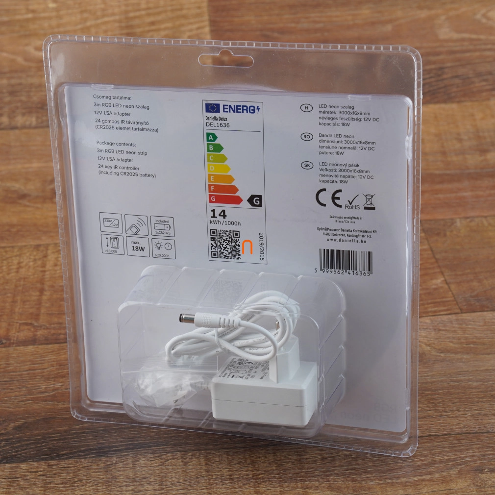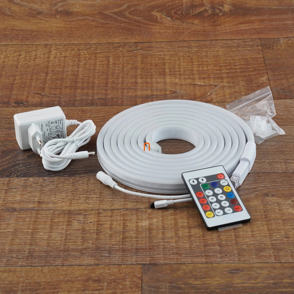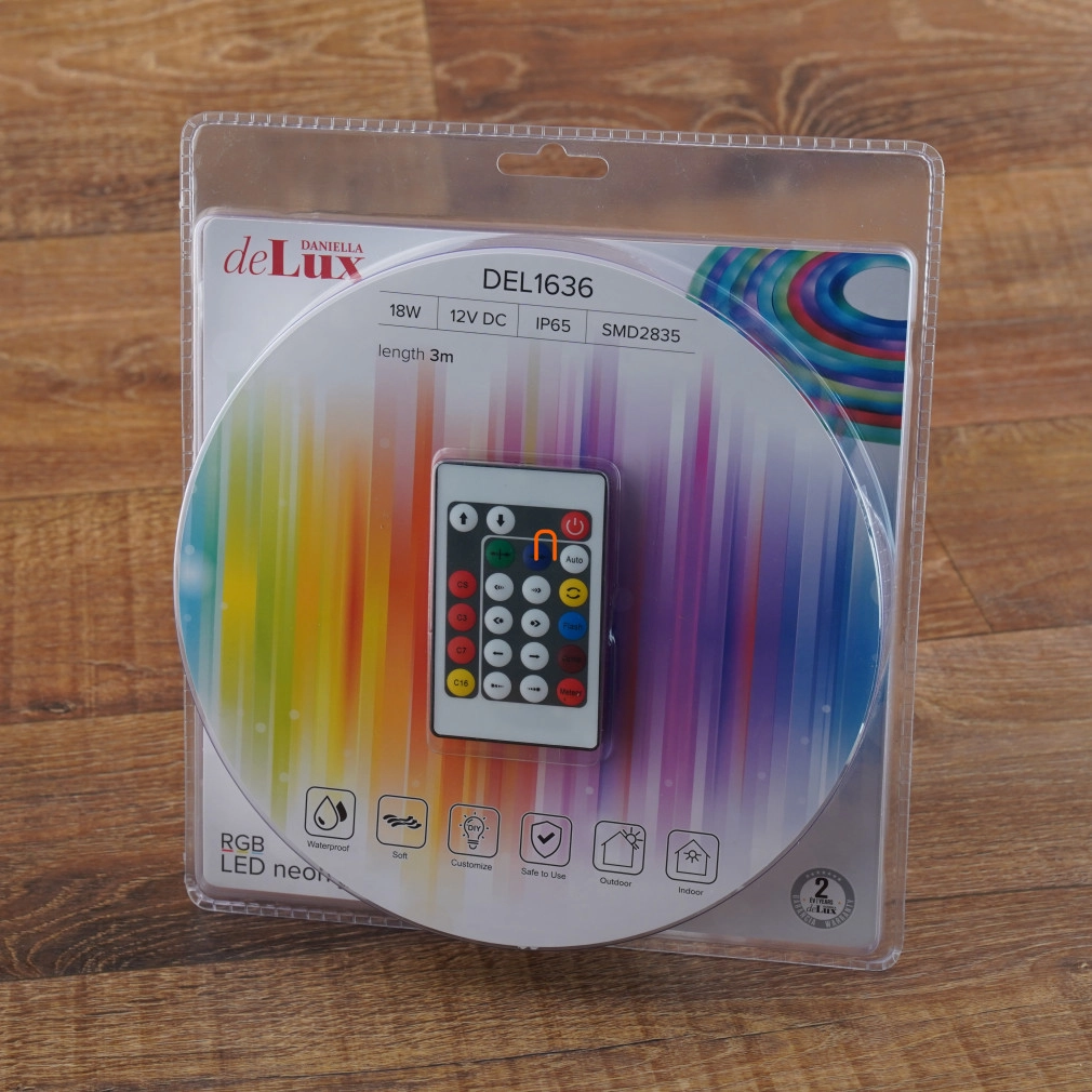 DEL1636 LED szalag neon flex RGB szett távirányítóval, tápegységgel, 3m, IP65,12V DC, 4,8W/m, 300lm/m, 120LED/m, SMD2835,delux