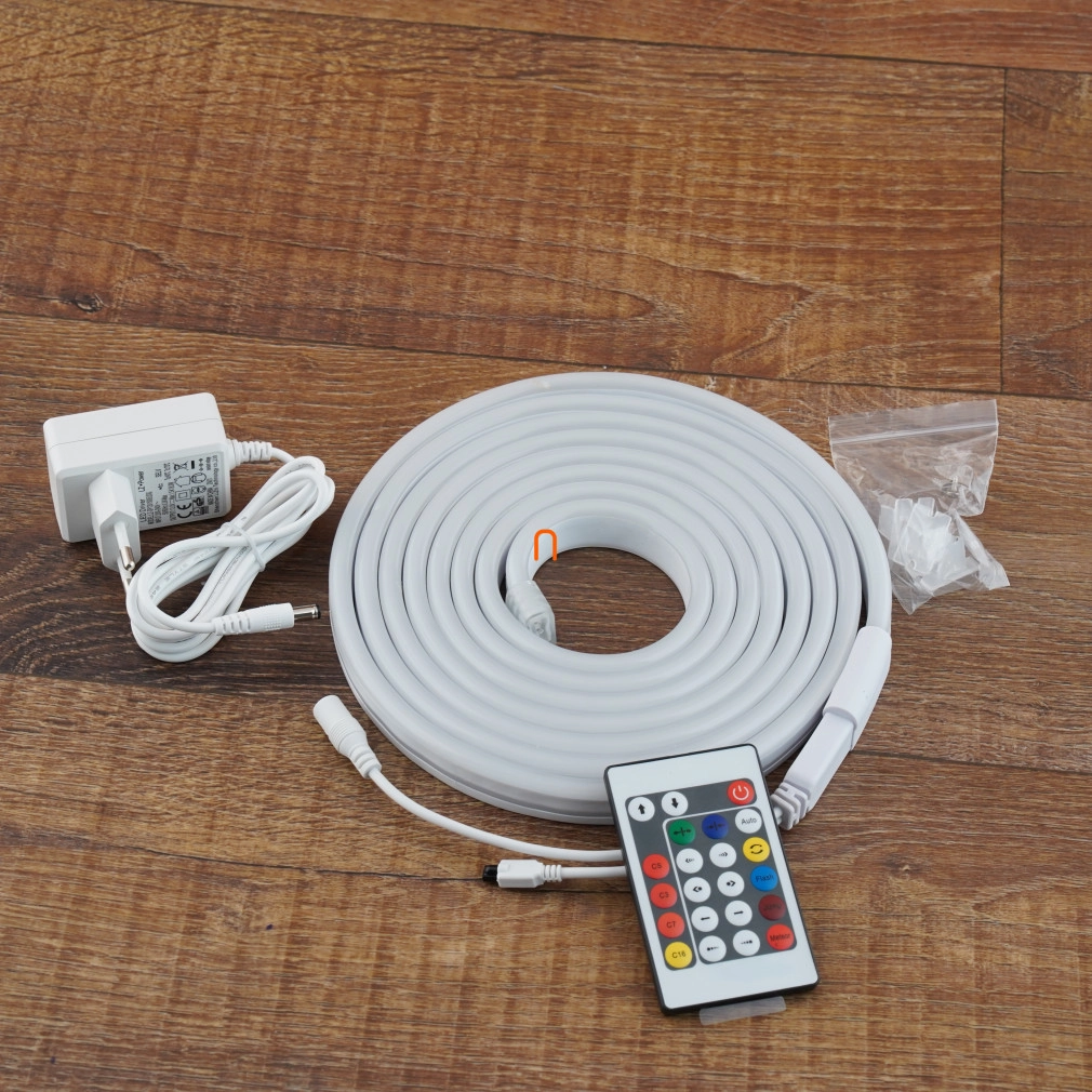 LED szalag neon flex RGB szett távirányítóval, tápegységgel, 3m, IP65,12V DC, 4,8W/m, 300lm/m, 120LED /m - DEL1636 deLux