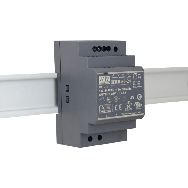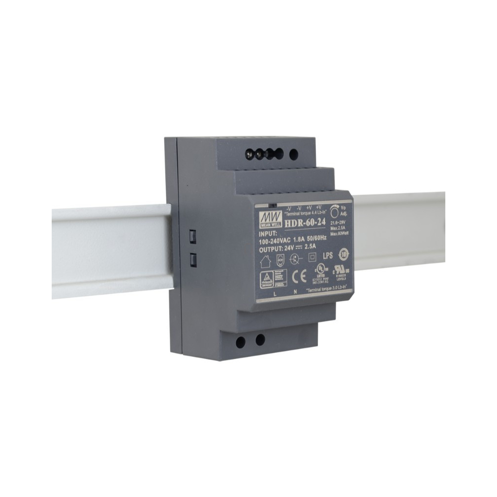 DIN sínre pattintható tápegység, Vin: 85-264VAC 120-370VDC, Vout: 24 VDC (0-2,5A), P: 60W Mean Well HDR-60-24