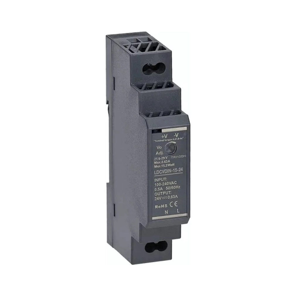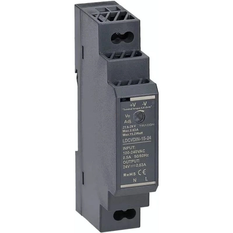 DIN sínre szerelhető tápegység szabályozható DC kimenettel DC24V,0,63A/15,2W LDCVDIN-15-24 Tracon