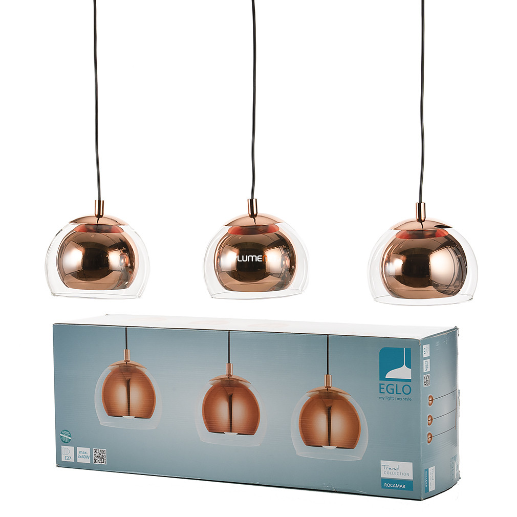 A Rocamar Eglo 94591 dupla búrás függesztett lámpa modern stílusú, vörösréz színű acél testtel és áttetsző üveg burával készül. A lámpatest három darab E27 foglalattal rendelkezik, amelyek cserélhető fényforrásokat támogatnak, így a fényáram, fényszín, teljesítmény és színhőmérséklet a választott izzótól függően alakítható. A lámpa nem szabályozható, IP20 védettséggel rendelkezik, beltéri használatra alkalmas. Méretei: 780 mm hosszúság, 190 mm szélesség és 1100 mm magasság, tömege 3,85 kg. A csomagolás mérete 19 x 29 x 78 cm. A fényforrásokat a termék nem tartalmazza.