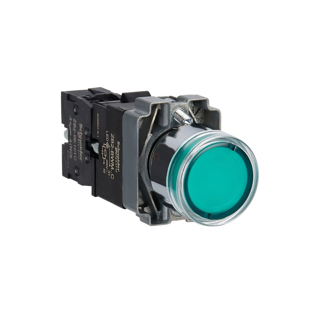 Schneider Electric Easy Harmony XB2 - XB2BW33M1C - Világító nyomógomb, zöld, AC 220V, fém, panelbe süllyesztett, 22mm, visszatérő