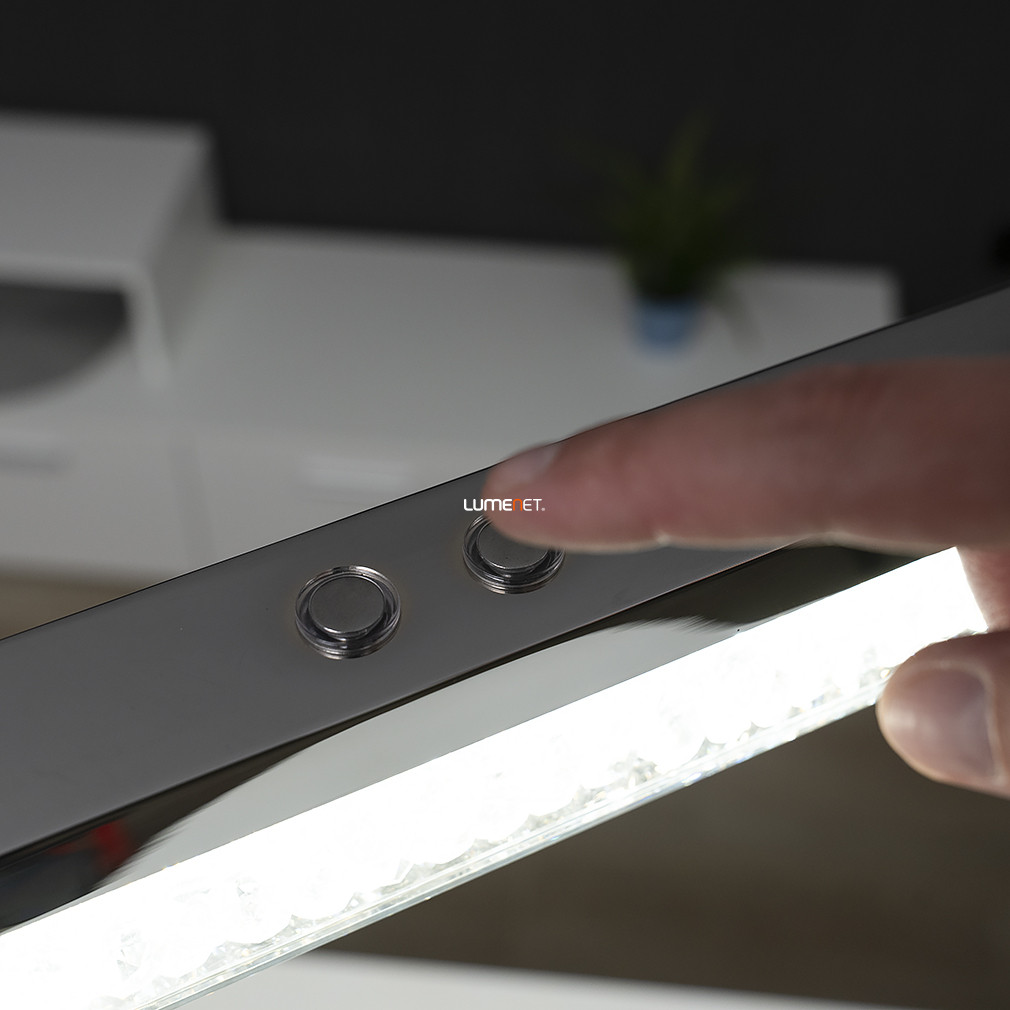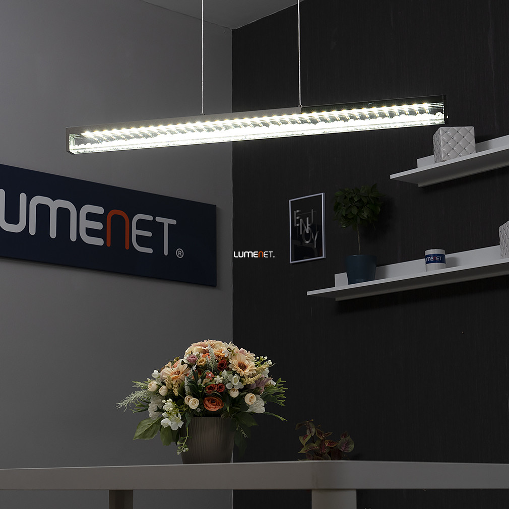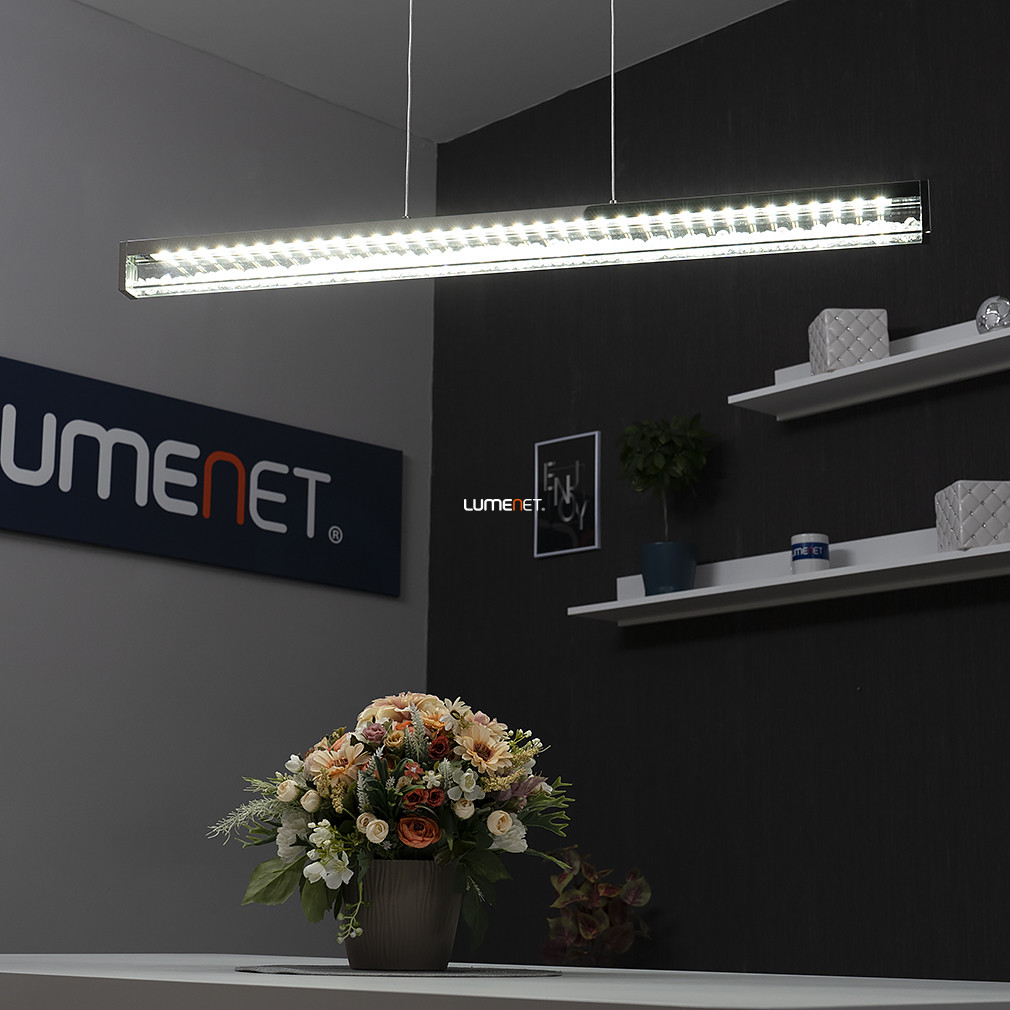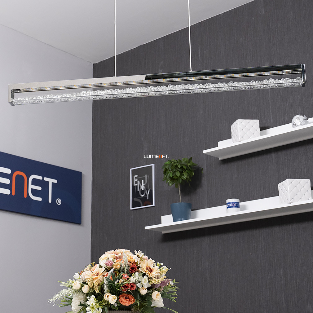 Az Érintőkapcsolóval szabályozható Cardito Eglo 93626 függesztett LED kristály lámpa modern stílusban készült, kiváló minőségű acél, alumínium, üveg és kristály anyagok felhasználásával. A lámpatest 32 W teljesítményű integrált LED modullal rendelkezik, amely 3420 lumen fényáramot biztosít, így hatékony megvilágítást nyújt. A fény színhőmérséklete 2700 és 5000 Kelvin között tetszés szerint állítható, lehetővé téve a változtatható fehér fény (TW) alkalmazását. A világítás érintőkapcsolóval szabályozható, ami kényelmes használatot tesz lehetővé. A lámpatest méretei: 1000 mm hosszúság, 80 mm szélesség és 1100 mm magasság. Az átlagos élettartam 25 000 óra, a védettség IP20-as besorolású. Az ezüst és áttetsző színű, modern kialakítású lámpa a lakásvilágítás kategóriájában helyezkedik el, a fényforrást a beépített LED modul biztosítja.