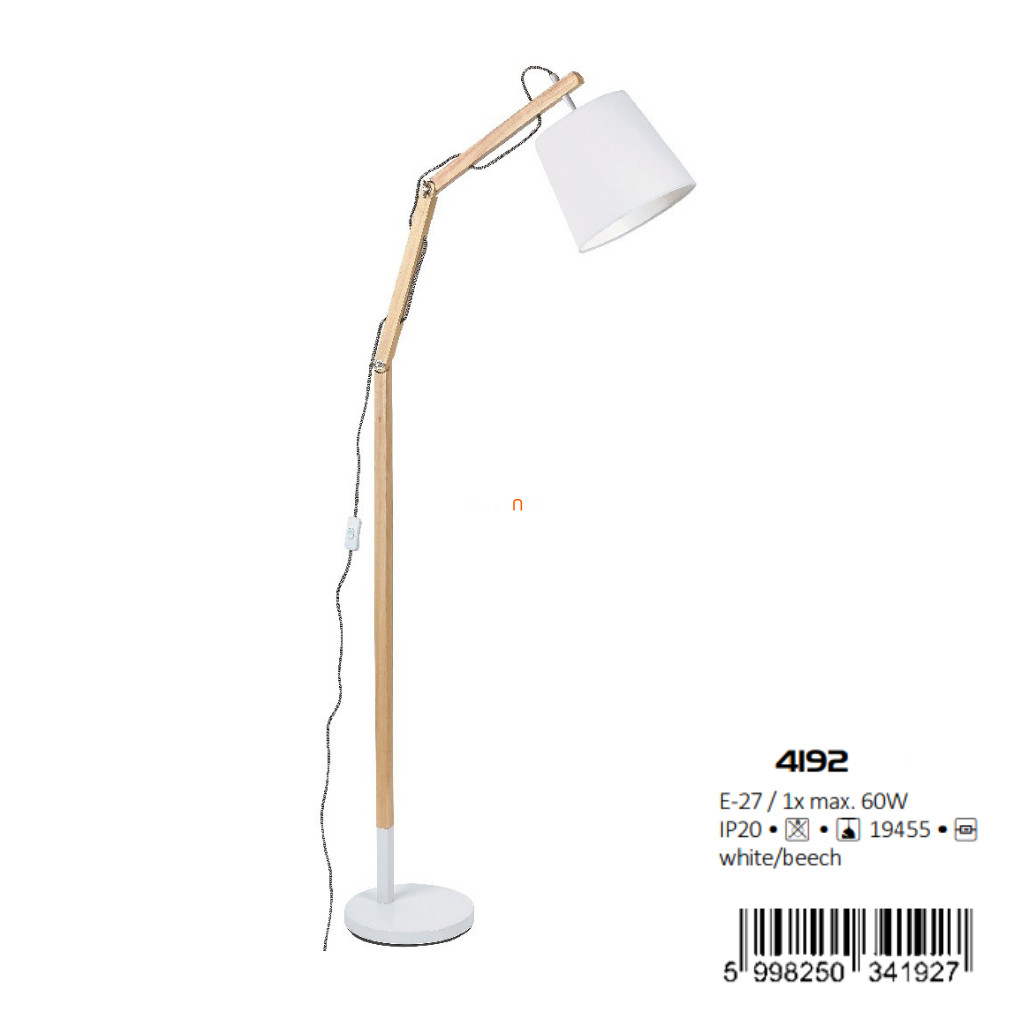 A Thomas Rábalux 4192 fa állólámpa 157 cm magas, vintage stílusú lakásvilágítási eszköz, amely természetes fa és fehér textil kombinációjával készül. A lámpatest egy darab E27 foglalattal rendelkezik, amely cserélhető fényforrás használatát teszi lehetővé. A termék nem tartalmaz fényforrást, így a kívánt fényerő, színhőmérséklet és teljesítmény szabadon választható. A lámpa IP20 védettséggel rendelkezik, így beltéri használatra alkalmas. Az állólámpa átmérője 23 cm, szélessége 60 cm, magassága 157 cm, tömege 6,52 kg. A csomagolás méretei: 97 cm széles, 26 cm hosszú és 24 cm magas. A termék a Rábalux gyártásában készült, és nem szabályozható.