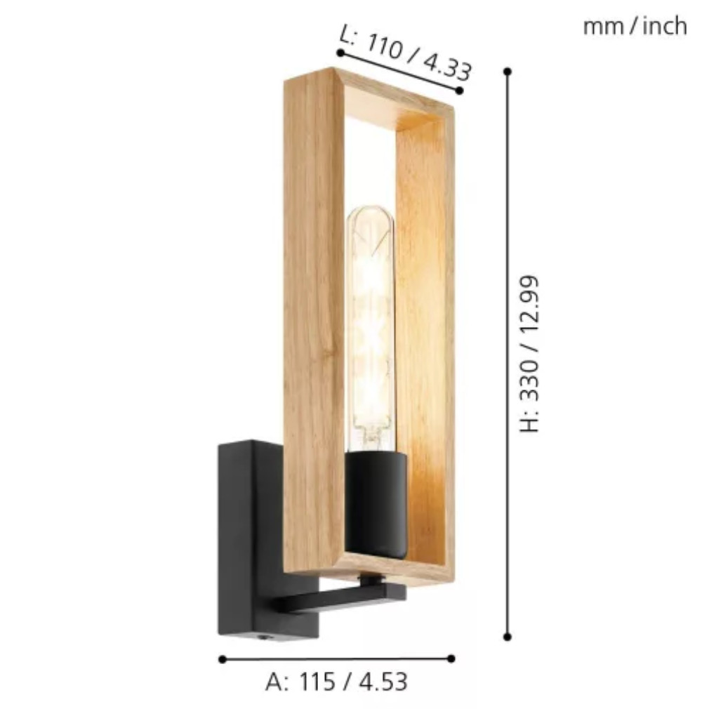 A Littleton Eglo 44055 fali lámpa fekete-barna színű acél és fa kombinációjával, vintage stílusban készült. A lámpatest egy darab E27-es foglalattal rendelkezik, amelybe cserélhető fényforrás szerelhető, így a fényáram, fényszín, teljesítmény és színhőmérséklet a választott izzótól függ. A termék IP20 védettségű, beltéri használatra alkalmas. Méretei: hossza 110 mm, szélessége 115 mm, magassága 330 mm, tömege 0,71 kg. A csomag nem tartalmaz fényforrást. Gyártója az EGLO.