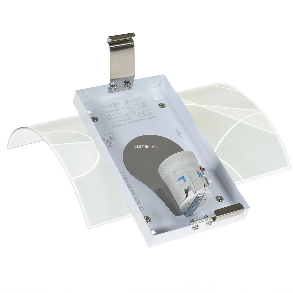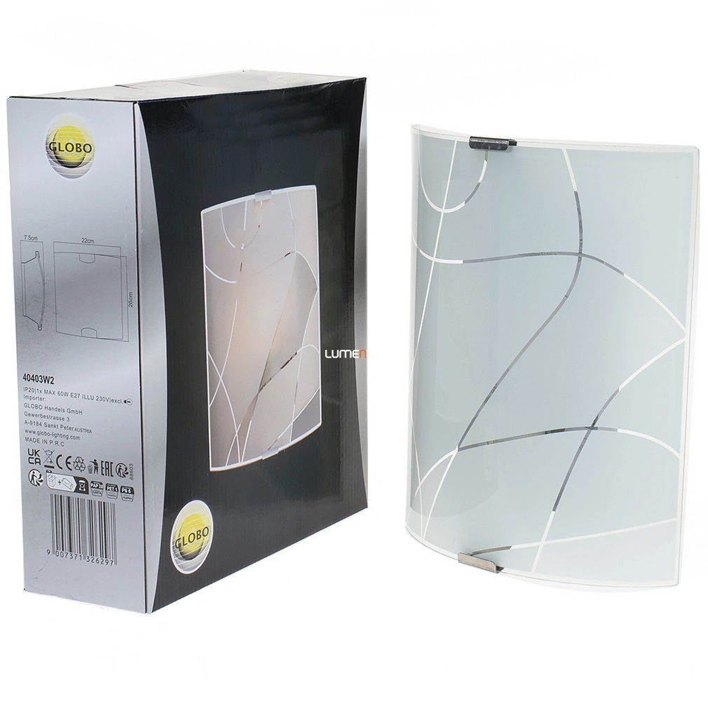 A Paranja Globo 40403W2 fali lámpa modern stílusú kialakítással, hajlított opál üveggel és mintázott felülettel rendelkezik. A lámpatest fém és üveg anyagokból készült, ezüst és opál színkombinációval. Egy darab E27 foglalattal szerelt, amelybe cserélhető fényforrás illeszthető, így a fényáram, színhőmérséklet és teljesítmény szabadon választható. A lámpa nem szabályozható, védettségi szintje IP20, beltéri használatra alkalmas. Méretei: 220 mm hosszúság, 260 mm szélesség, 80 mm magasság, tömege 0,8 kg. A csomagolás méretei: 8 cm szélesség, 25 cm hosszúság és 25 cm magasság. A terméket a Globo gyártja, a fényforrást nem tartalmazza.