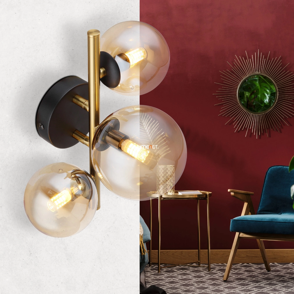 A Riha Globo 56135-3W fali lámpa három darab, melegfehér fényt kibocsátó LED fényforrással rendelkezik, amelyek G9 foglalatba illeszkednek. A lámpatest teljesítménye 3x3,5 watt, a fényforrások színhőmérséklete 3000 Kelvin, amely kellemes, meleg hangulatot biztosít a helyiségben. A lámpatest fényárama 80 lumen, nem szabályozható kivitelben készült. Modern stílusú, fém és üveg anyagokból épül fel, fekete, arany és borostyán színek kombinációjával. Méretei 280 mm hosszúság, 210 mm szélesség és 190 mm magasság. Az IP20-as védettség beltéri használatra teszi alkalmassá. A termék tartalmazza a LED fényforrásokat, csomagolási méretei 39x29x16 cm, tömege 1,07 kg. A gyártó a Globo.