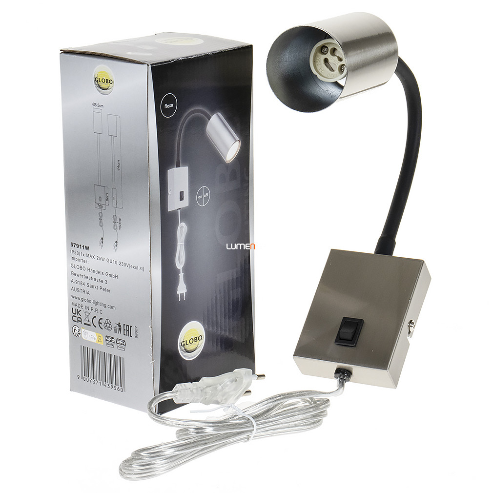 A Robby Globo 57911W fali lámpa mozgatható szárral funkcionális kialakítást kínál, amely lehetővé teszi a fény irányának precíz beállítását. A lámpatest fő anyaga fém, nikkel színben, amely modern megjelenést biztosít. A termék egy GU10 foglalattal rendelkezik, amelybe cserélhető fényforrás helyezhető, így a fényáram, fényszín és színhőmérséklet igény szerint választható. A lámpa kapcsolóval szerelt, nem szabályozható, IP20 védettségi besorolással rendelkezik, így elsősorban beltéri használatra alkalmas. A termék tömege 0,42 kg, méretei: hosszúsága 320 mm, szélessége 70 mm, magassága 440 mm. A csomagolás mérete 8x10x23 cm. A lámpatest nem tartalmaz fényforrást, azt külön szükséges beszerezni.