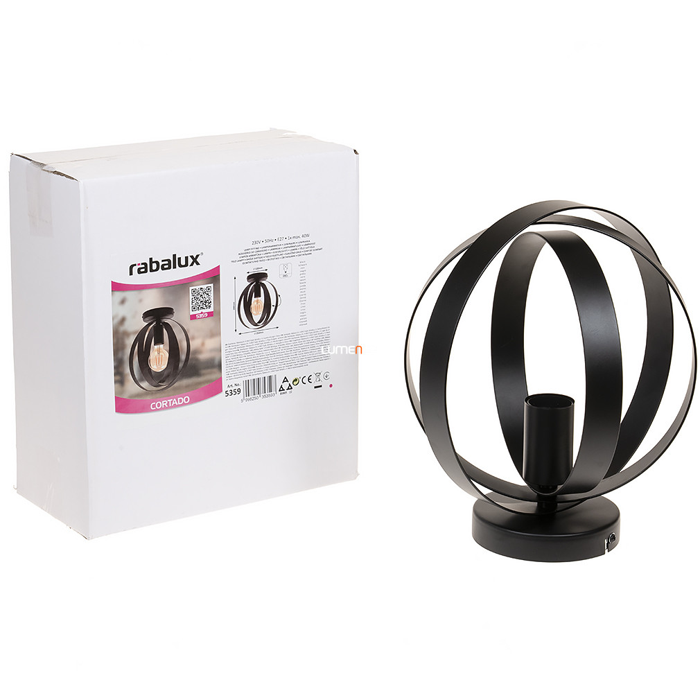 A Cortado Rábalux 5359 fekete mennyezeti lámpa modern szalag hatású kialakítással rendelkezik, amely vintage stílust ötvöz korszerű funkcionalitással. A lámpatest fém anyagból készült, amely tartósságot és stabilitást biztosít. Egy darab E27-es foglalattal szerelt, így a fényforrás cserélhető, lehetővé téve a kívánt fényáram, fényszín, teljesítmény és színhőmérséklet kiválasztását. A lámpa nem szabályozható, IP20-as védettséggel rendelkezik, ezért beltéri használatra alkalmas. Átmérője 250 mm, magassága 280 mm, tömege 1,4 kg. A csomagolás méretei: 26 cm szélesség, 13 cm hosszúság, 29 cm magasság. A terméket a Rábalux gyártja, a fényforrást nem tartalmazza.