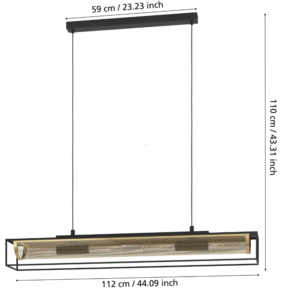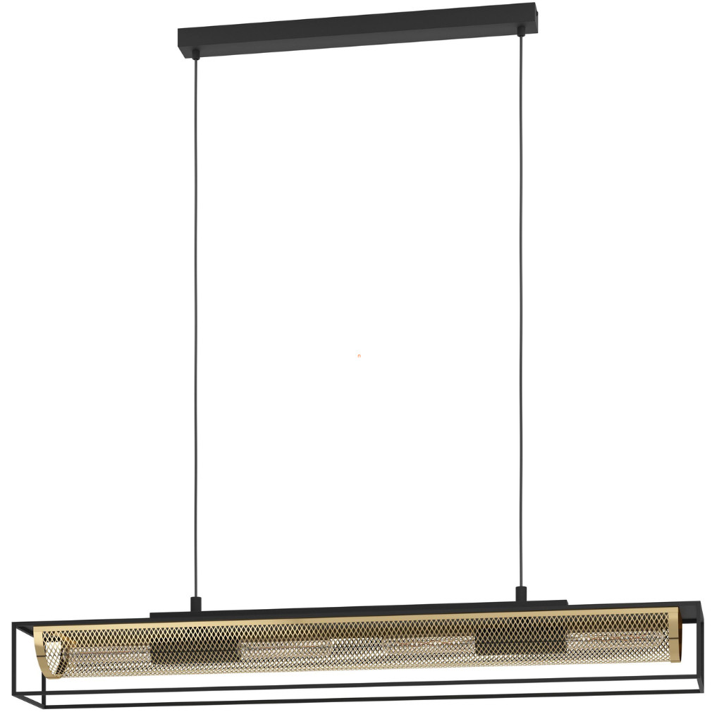 A Nohales Eglo 43788 fémhálós függesztett lámpa arany színben modern lakásvilágítási megoldást kínál, amelyet négy darab E27-es foglalattal láttak el. A lámpatest acélból készült, fekete és arany színkombinációval, ami elegáns megjelenést biztosít. A lámpa teljes hossza 1120 mm, szélessége 170 mm, magassága pedig 1500 mm, így nagyobb terek megvilágítására is alkalmas. A termék IP20 védettségi besorolással rendelkezik, ezért beltéri használatra ajánlott. A fényforrás nem tartozék, így a fényáram, teljesítmény és színhőmérséklet a választott izzótól függően változtatható. A termék tömege 5,045 kg, csomagolási méretei pedig 1130 mm hosszúság, 180 mm szélesség és 180 mm magasság. A Nohales Eglo 43788 lámpát az EGLO gyártja, logisztikai kódja 43788.