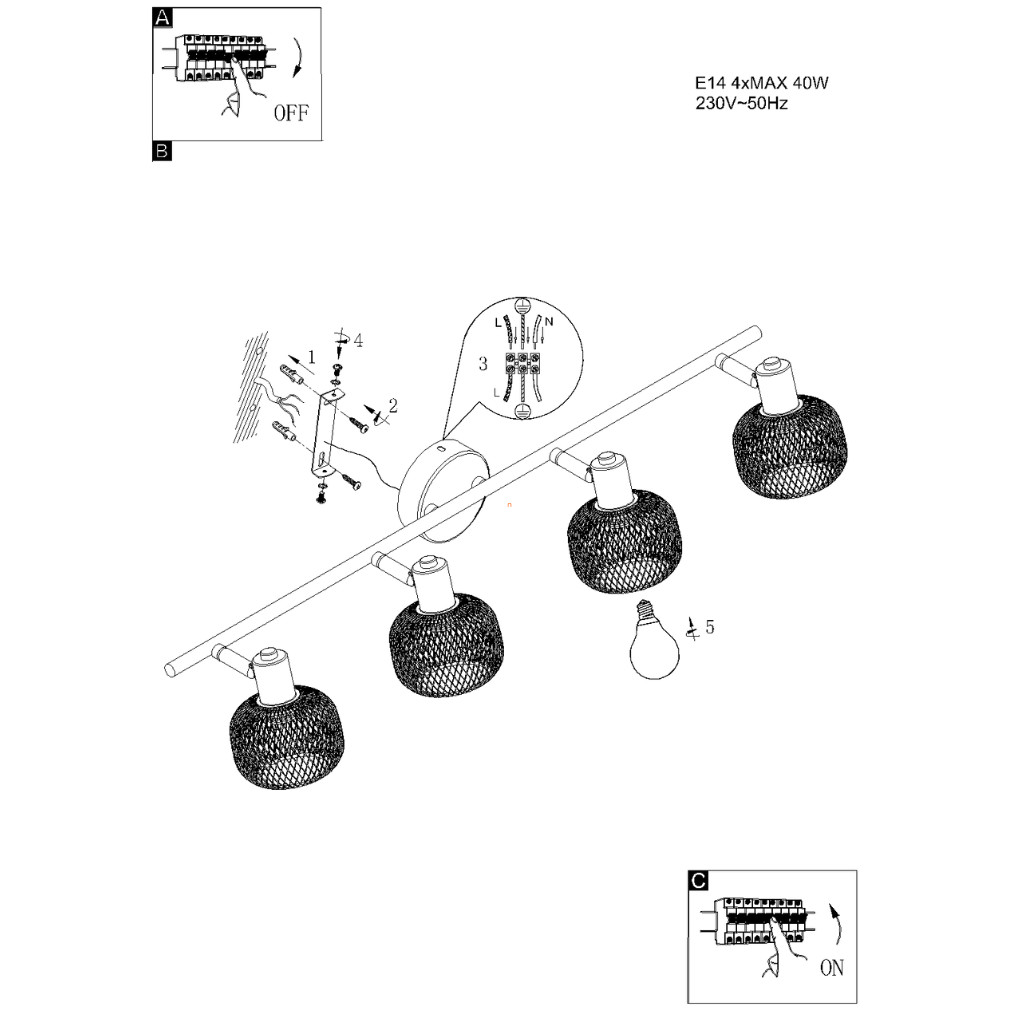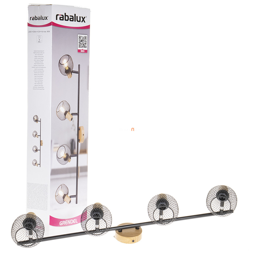 A Grendel Rábalux 3130 fémhálós spot lámpa négy darab E14-es foglalattal rendelkezik, amelyekbe cserélhető fényforrások helyezhetők el. A lámpa váza fekete színű fémből és fa elemekből készült, vintage stílusú megjelenéssel. A termék IP20-as védettséggel bír, így beltéri használatra alkalmas. A lámpatest teljes hossza 755 mm, szélessége 145 mm, magassága 175 mm, tömege 0,88 kg. A spot lámpa nem tartalmaz fényforrást, és nem szabályozható. A csomagolás mérete 77 mm széles, 180 mm hosszú és 110 mm magas. A gyártó a Rábalux.