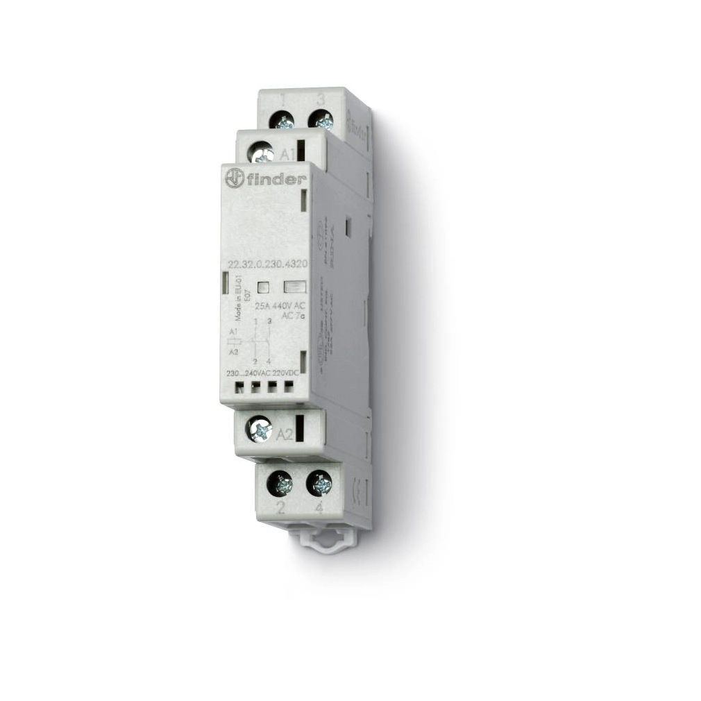 FINDER 22.32.0.024.4420 Installációs mágneskapcsoló, 2 nyitóérintkező 25 A, tápfeszültség: 24 V AC/DC, LED + mech. állapotjelzés