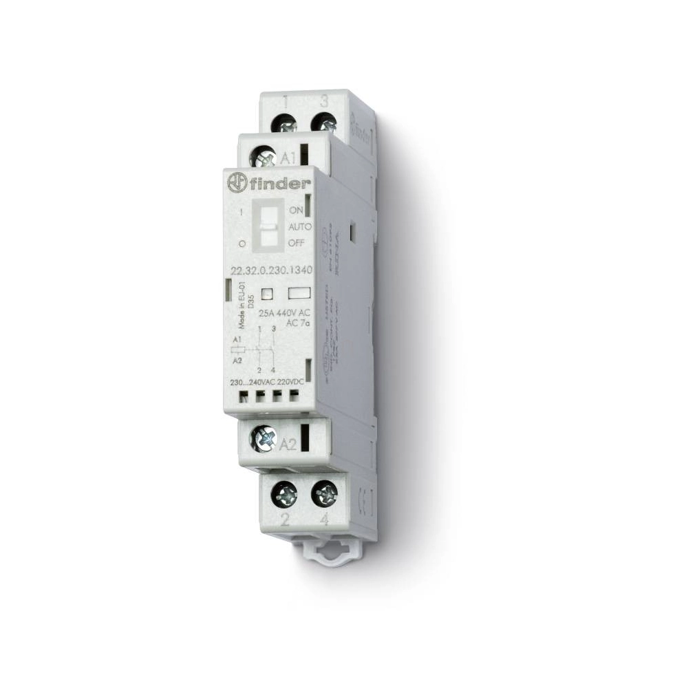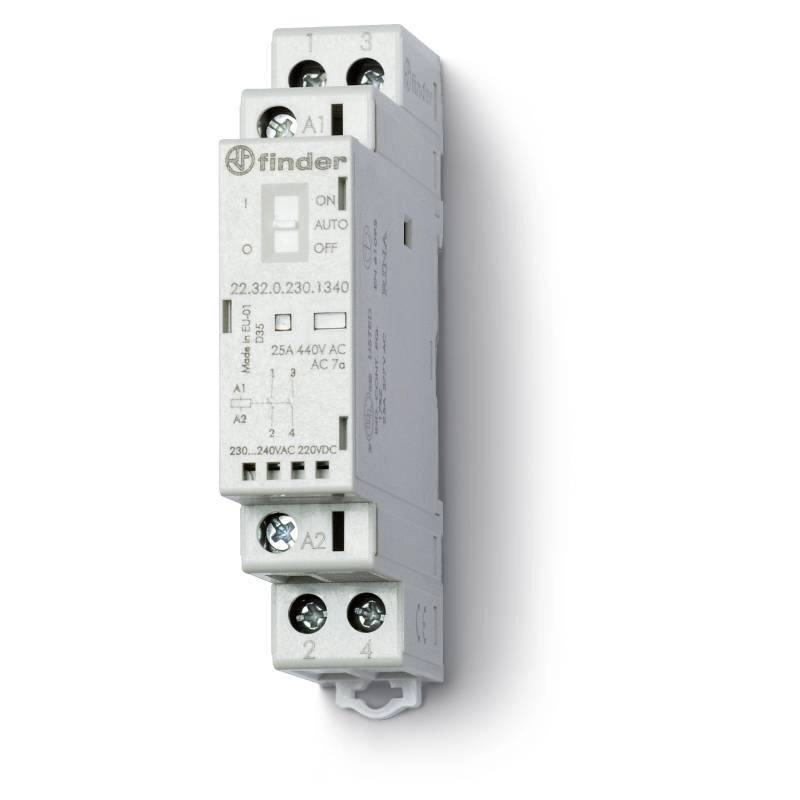 Finder 22.32.0.230.1340 Installációs mágneskapcsoló, 2 záróérintkező 25 A, tápfeszültség: 230 V AC/DC, Auto-Off-On - kapcsoló