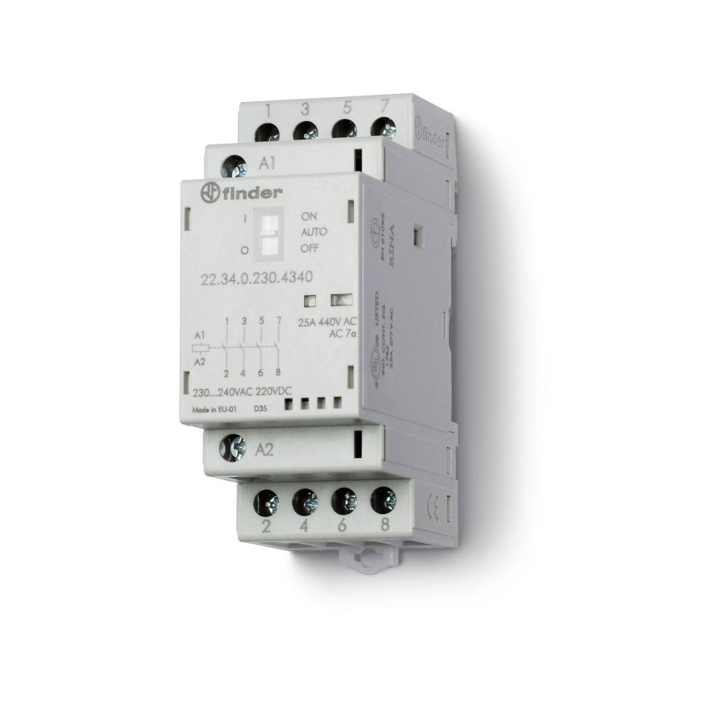 FINDER 22.34.0.230.4340 Installációs mágneskapcsoló, kontaktor, 25A (AC-7a), 4NO, 230V AC/DC, On-Auto-Off kapcsoló + mechanikus állapotjelzés + LED