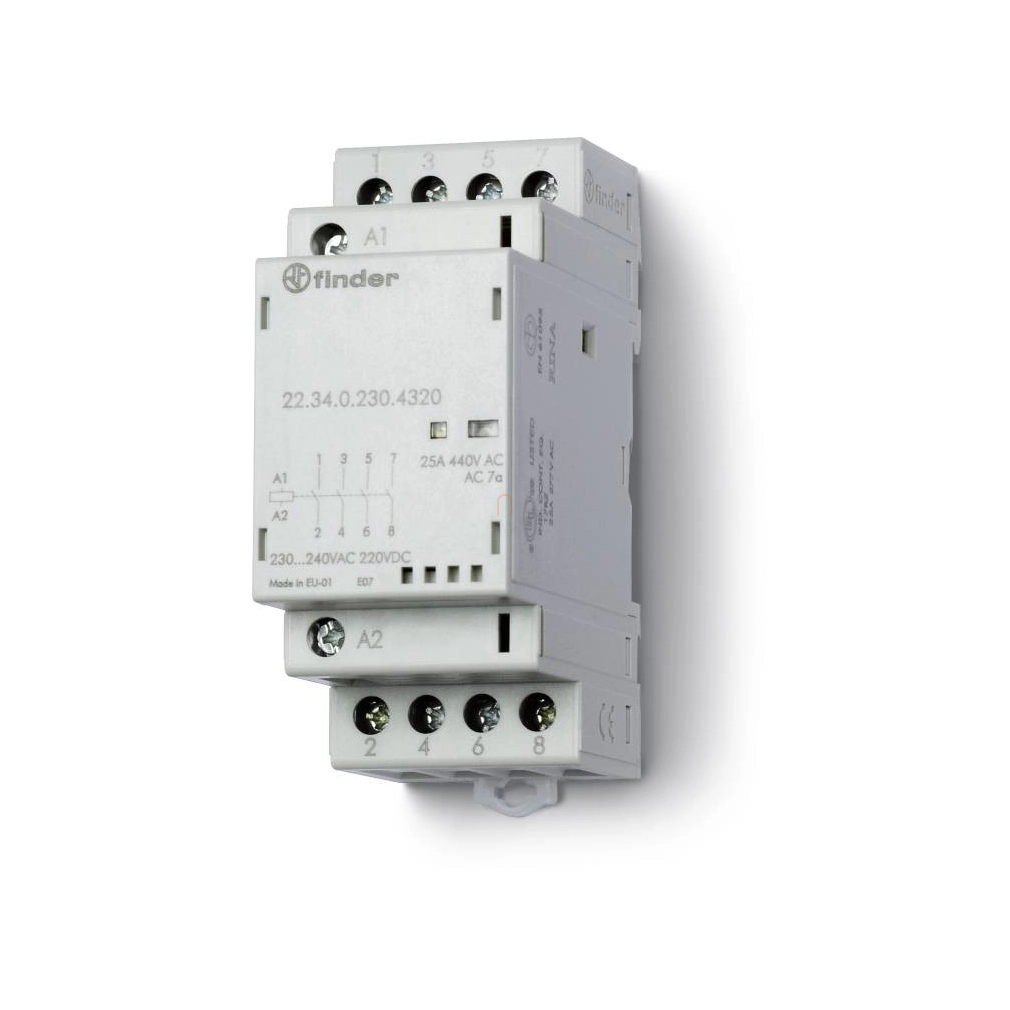 FINDER 22.34.0.230.4720 Installációs mágneskapcsoló, kontaktor, 25A (AC-7a), 3NO+1NC, 230V AC/DC, mechanikus állapotjelzés + LED
