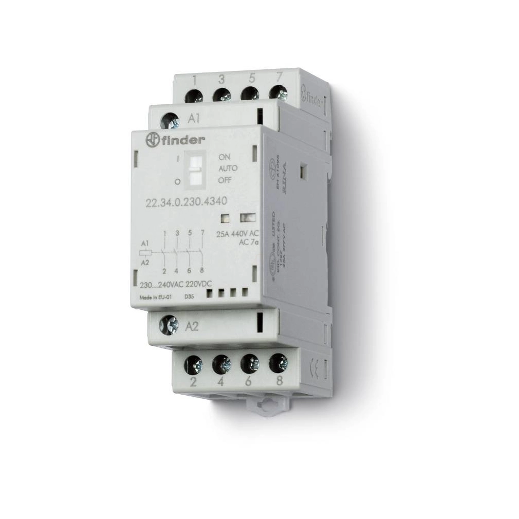FINDER 22.34.0.230.4740 Installációs mágneskapcsoló, kontaktor, 25A (AC-7a), 3NO+1NC, 230V AC/DC, On-Auto-Off kapcsoló + mechanikus állapotjelzés + LED