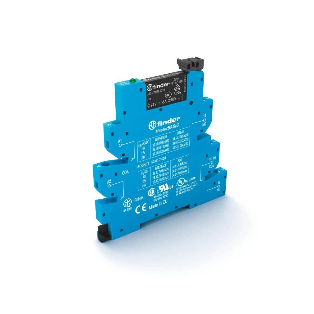 Finder 39.11.0.012.0060 csatoló relé modul - MasterBASIC, csavaros csatlakozással, 1 váltóérintkező 6 A, vezérlőfeszültség: 12 V AC/DC