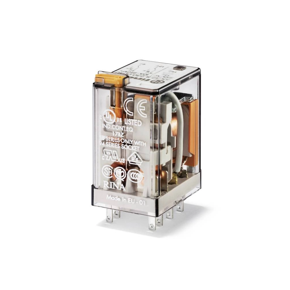 \nMiniatűr ipari relé, 94-es foglalatba dugaszolható, 2 váltóérintkező 10 A / 250 V AC, érintkező anyag: AgNi, tekercsjellemzők: 12 V AC, 1,5 VA, 50 Ohm, zárható teszt nyomógomb + mechanikus állapotjelzés, védettségi mód: RT I