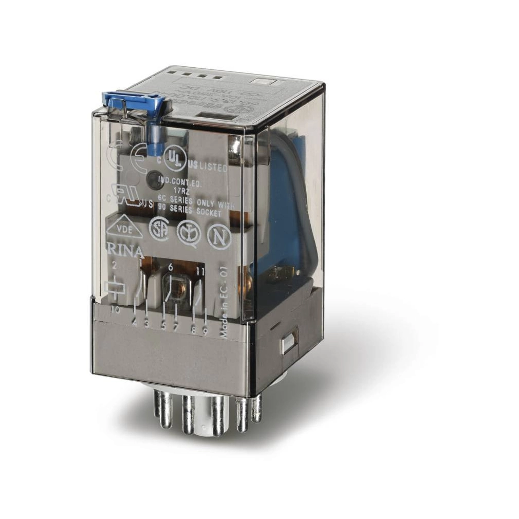 \nIpari relé, dugaszolható, 3 váltóérintkező 10 A / 250 V AC, érintkező anyag: AgNi, tekercsjellemzők: 48 V DC, 1,3 W, 1.770 Ohm, zárható teszt nyomógomb + mechanikus állapotjelzés, védettségi mód: RT I