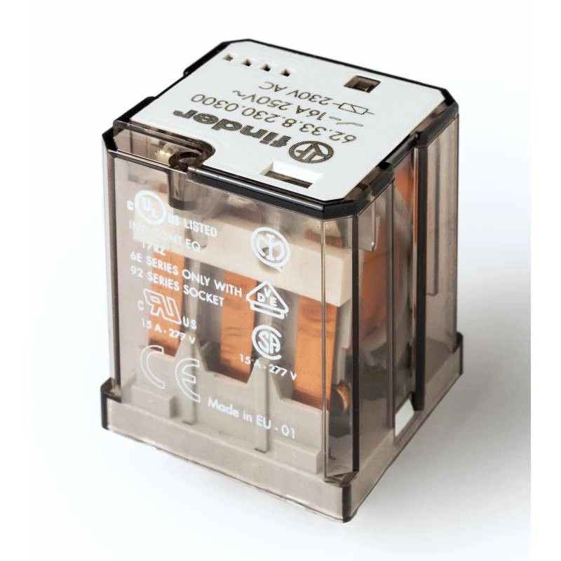 \nTeljesítményrelé, dugaszolható, 3 záróérintkező 16 A / 250 V AC, Faston 187 (4,8 x 0,5 mm), a nyitott érintkezők távolsága > 3 mm, érintkező anyag: AgCdO, tekercsjellemzők: 230 V AC, 3 VA, 5.000 Ohm, védettségi mód: RT I