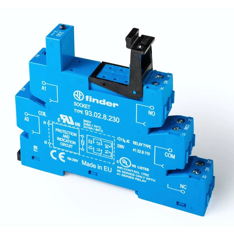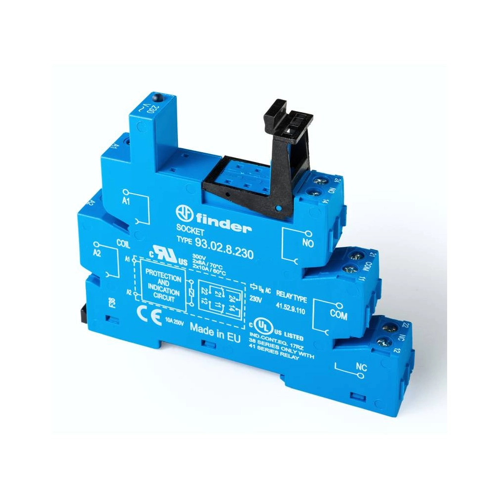 FINDER 93.02.8.230 Foglalat csavaros csatlakozással, relé típusa: 41.52, 41.81 vagy 41.61, vezérlőfeszültség: (230...240)V AC